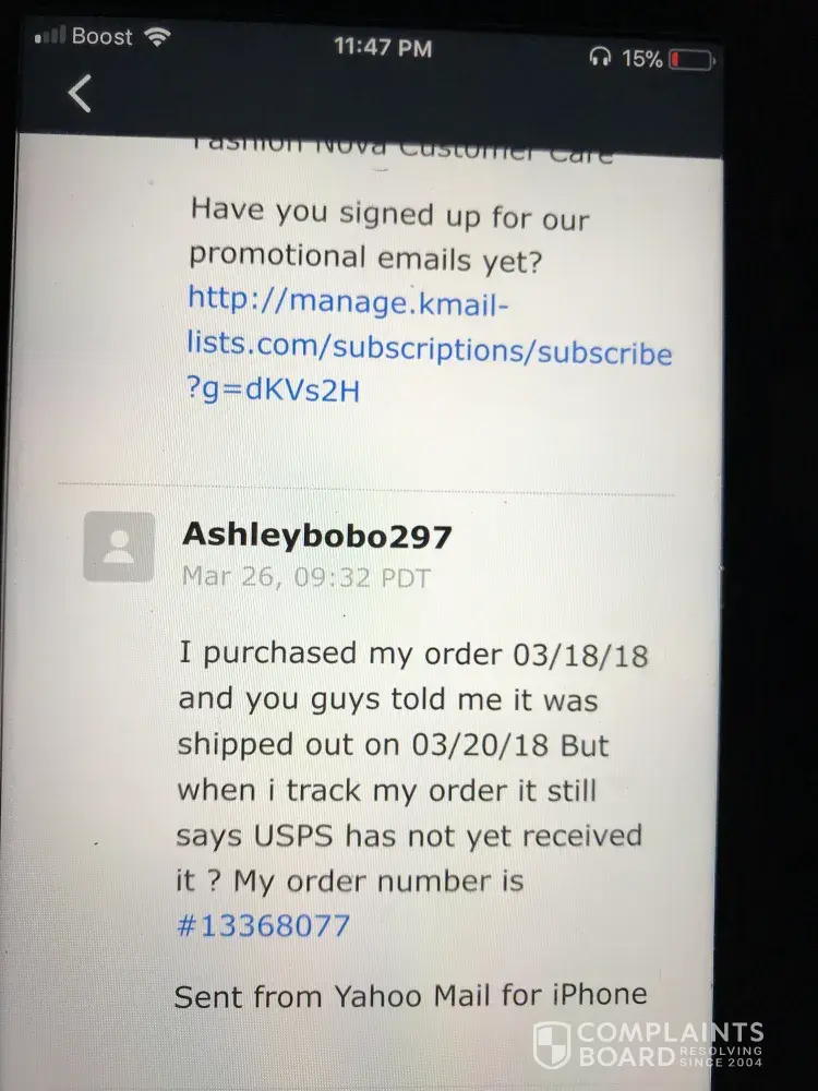 I have send several emails to fashionnova and I was told that there is nothing they can do and I should file a claim with USPS which I did and believe I should not have because it should be fashionnova responsibility to make their customer happy. I will not be ordering anything from here is my problem is not fixed and will make sure I stop my family and friends about this bad customer service. My email is morenike2010@yahoo.com