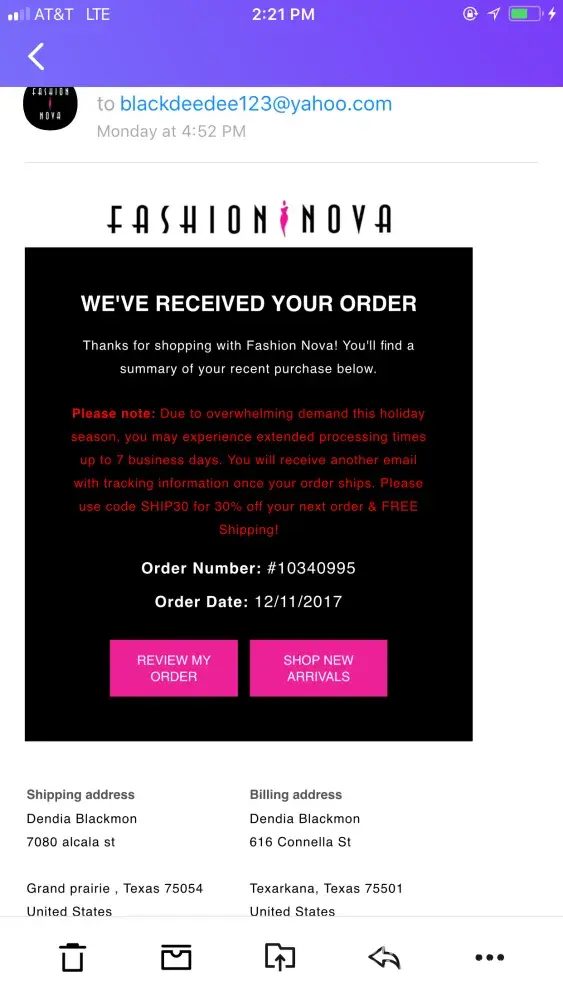 One of MANY emails I have sent to Fashion Nova that summarizes my issues with the company. I have spent about $1, 000.00 with this company and this is the type of service I receive. I have NEVER been able to actually speak with someone, I have only received automated messages. The first time I ordered it took OVER A MONTH to receive my items and half of them were not even in stock. I was supposed to be issued a refund and NEVER received it. That is STEALING! I was also issued a 30% off coupon that NEVER WORKED. The most recent order was going to be up to 7 days processing because of the holidays (which I agreed to) but has now been 10 days and my order has still not been sent out. This is the 2nd time this company has ruined my vacation. They can resolve this issue by contacting me and making arrangements to have my package shipped out TODAY via 1-day shipping that I am willing to pay for. I will continue to post negative reviews on ALL social media platforms and discourage everyone from purchasing from this company. I will be contacting bloggers and social media influencers to write about this poorly run company.