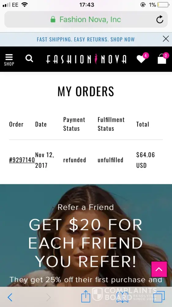 I placed my 1st order with FashionNova.com about 1 week ago, I was then emailed saying one item I ordered and paid for is out of stock and was issues store credit, I checked the website for the item and it was neither out of stock or low stock. I emailed FashionNova and got no reply after emailing 3 times, I got one reply saying it is out of stock and I should be "cautious" when ordering next time keeping in mind it is their fault that the website never stated out of stock or low in stock. I gave them a second chance and placed another order using the store credit, but had to pay for shipping Again at my own expense. I had the same problem with another product, so I emailed again and the person emailing kept making excuses. I have not even been store credited for this item, and have asked repeatedly that I get a full refund for the whole order and I will ship back the items at my own expense as well as opening dispute in Paypal which has not been replied to either. I clearly proved in the emails to the company that these items still to this day have never been out of stock or low in stock. I have gone online and read reviews and this has been a big waste of my money that I demand to have back, and learned they do this to majority of customers as a way of scamming for them to pay for shipping over and over. I would please like them to give a full refund back into my account for the second order and I will send order back to them at my own expense. This is clearly the companies fault and I should not have to pay for their mistakes.