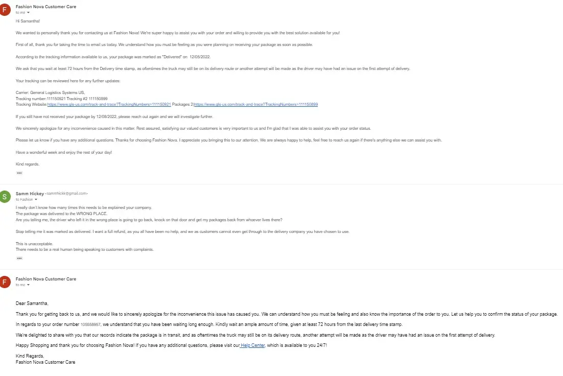 Placed an order on 11/26. It finally shipped on 12/04. The company they are using for shipping is gls. I received a message on 12/05 saying my packages were delivered. I knew that was not the case, as I am the manager of my building and no deliveries were made by that time in the morning. The photo of the "delivery" is on the ground outside of some rundown house with bars on the windows, not an apartment building. I live in a large apartment building, which is why I provided my apartment number. When you google the address I provided my building is the only place that shows up. Fashion nova will not provide any kind of update or help until it's been 72 hours. I have already waited weeks for my package and now i'm being told there's nothing they can do. The emails are all computer automated, and there is no number to call. This has cost me over $200. The delivery company is also giving me the runaround and both fn and gls keep telling me the package was delivered. I have spent thousands of dollars with this company in the past, and this is insane that they won't do a single thing but take your money and ignore you. They say they are not responsible for packages that are stolen or picked up by someone else, however the awful delivery company they decided to use delivered it to the wrong place... And somehow that's my fault? This needs to be fixed immediately.