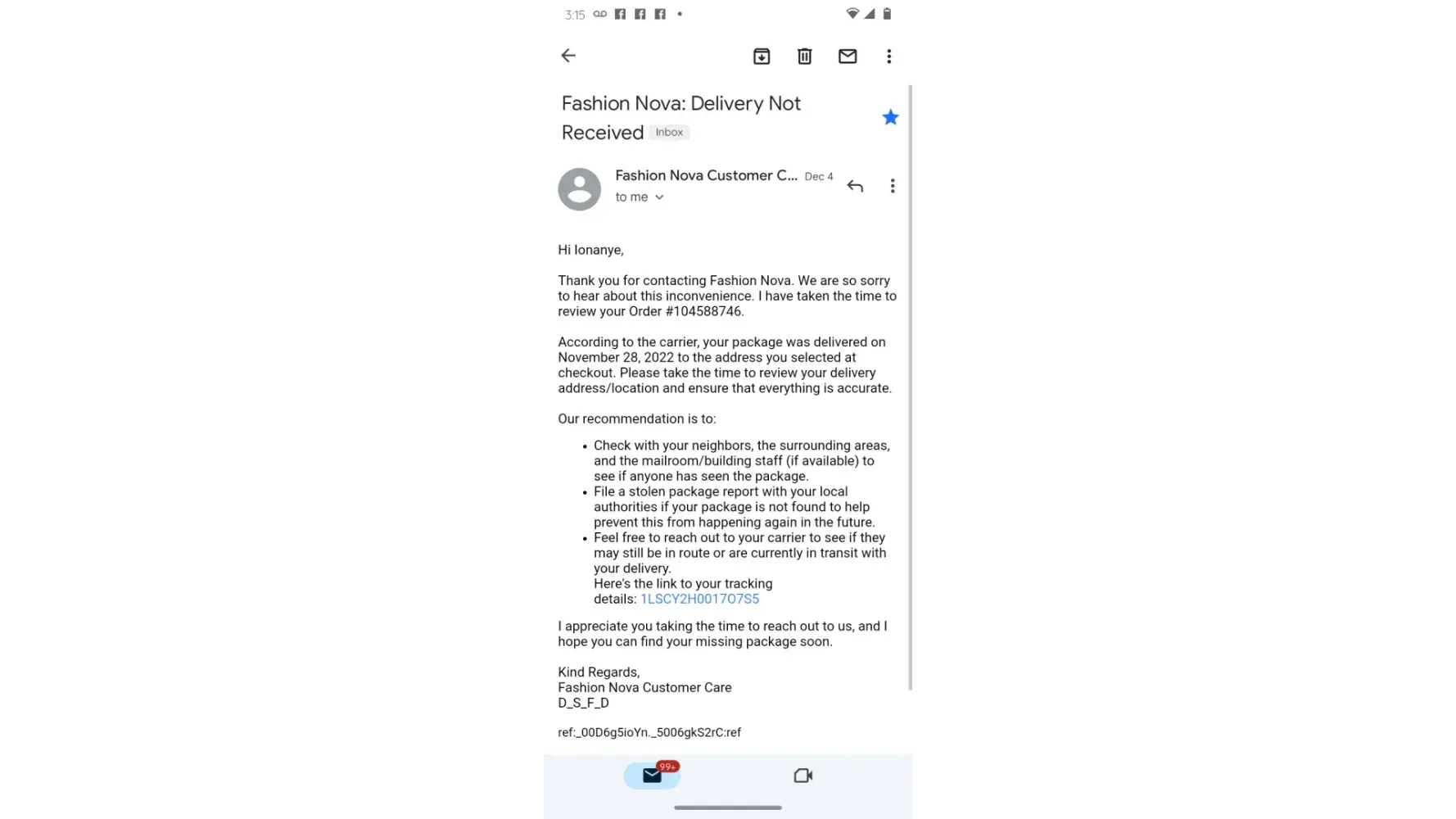 Fashion Nova Dress and no resolution for missing package
