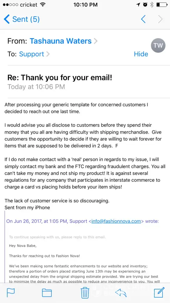 I also agree with you regarding fashionnova's poor customer service. I failed to get them via phone after multiple attempts. Fashion nova need to have more respect for its customers, we don't have to spend our hard earn money with them.