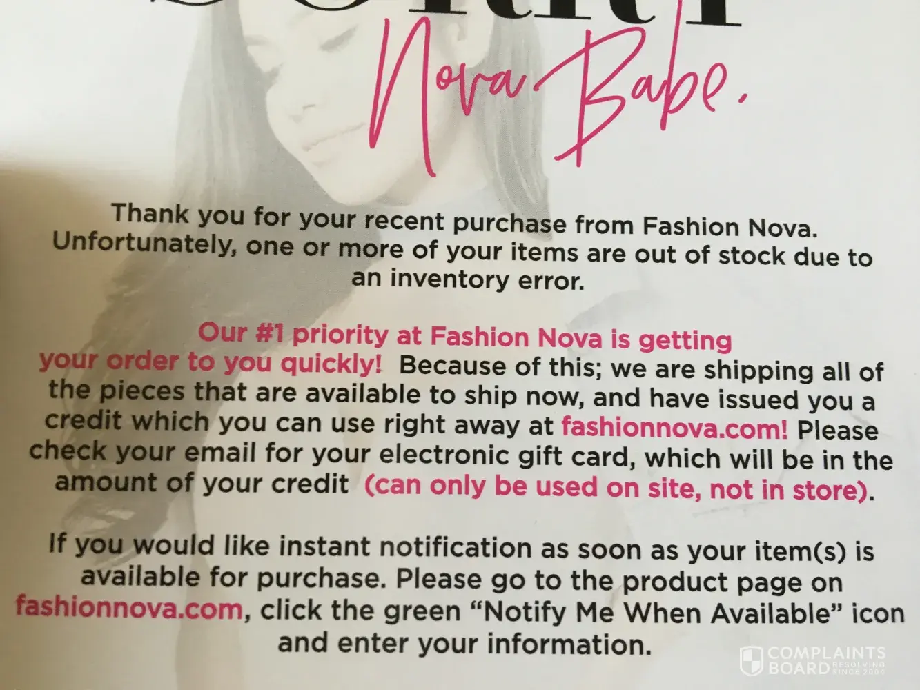 Customer Service is pretty much non existent. Talked to a supervisor on the phone and she talked over me the whole time. Emailed once, no answer. Emailed again, and pretty much got a sorry but we aren't going to do anything about it (attached pictures of correspondence). I placed many orders with Fashion Nova and that was my last order with them. The supervisor really turned me off.