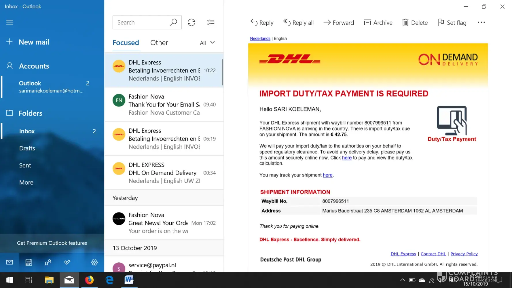 10/13/2019 I ordered two items (order #[protected]), paying $45 in total of which $15 for international shipping. When my items arrived in the Netherlands, 10/15/2019, I received an email from DHL saying I had to pay about $45 (€42.75) for import duty/tax. When I called them they explained to me that Fashion Nova hadn't filled in the shipping fee correctly, causing a high tax fee. DHL can't do anything about it, because they are just doing their job and they just act according to the law. However, because of Fashion Nova's sloppiness, I now have to pay basically twice for my order (2x $45), which is absolutely absurd!