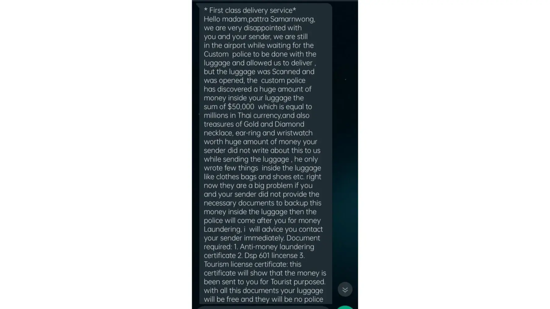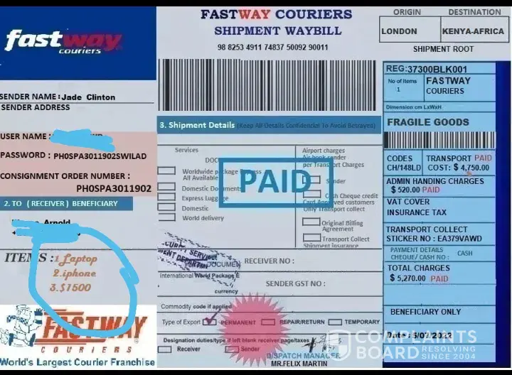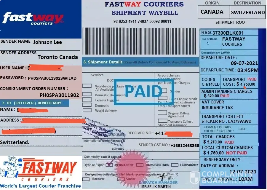 Den ich habe heute auch eine ähnliche WhatsApp bekommen. Da soll ich mal schnell Inlandgebühren für die Zusendung von 2 Rollkoffern und etwas Kanadische Dollars in Bar. USD 1500 per Westetn Union an eine Bank in Malaysia bezahlen. Obwohl laut Frachtschein/Auftragsbestätigung alles bezahlt ist. So steht es auf jeden Fall als Paid mit Rahmen auf diesem Dokument.. Welches mir vom Auftraggeber letzte Woche in Farbe zugesandt wurde.