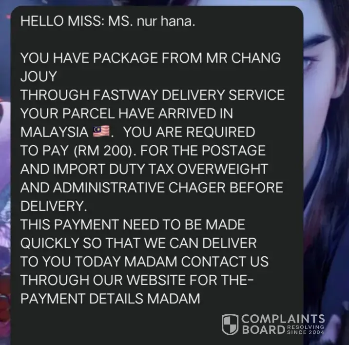 saya baru sahaja kena parcel scam dengan syarikat fastway courier ni, mereka mengugut saya untuk menangkap saya sekiranya tidak membayar parcel tersebut dengan harga rm1200. memang tak masuk akal langsung wey! mohon ambik tindakan pihak pengurusan, saya tak nak orang lain menjadi mangsa lagi selepas ini, disebabkan ini, saya telah mengalami depresi yang membuatkan saya takut untuk keluar bekerja, sila ambik tindakan!