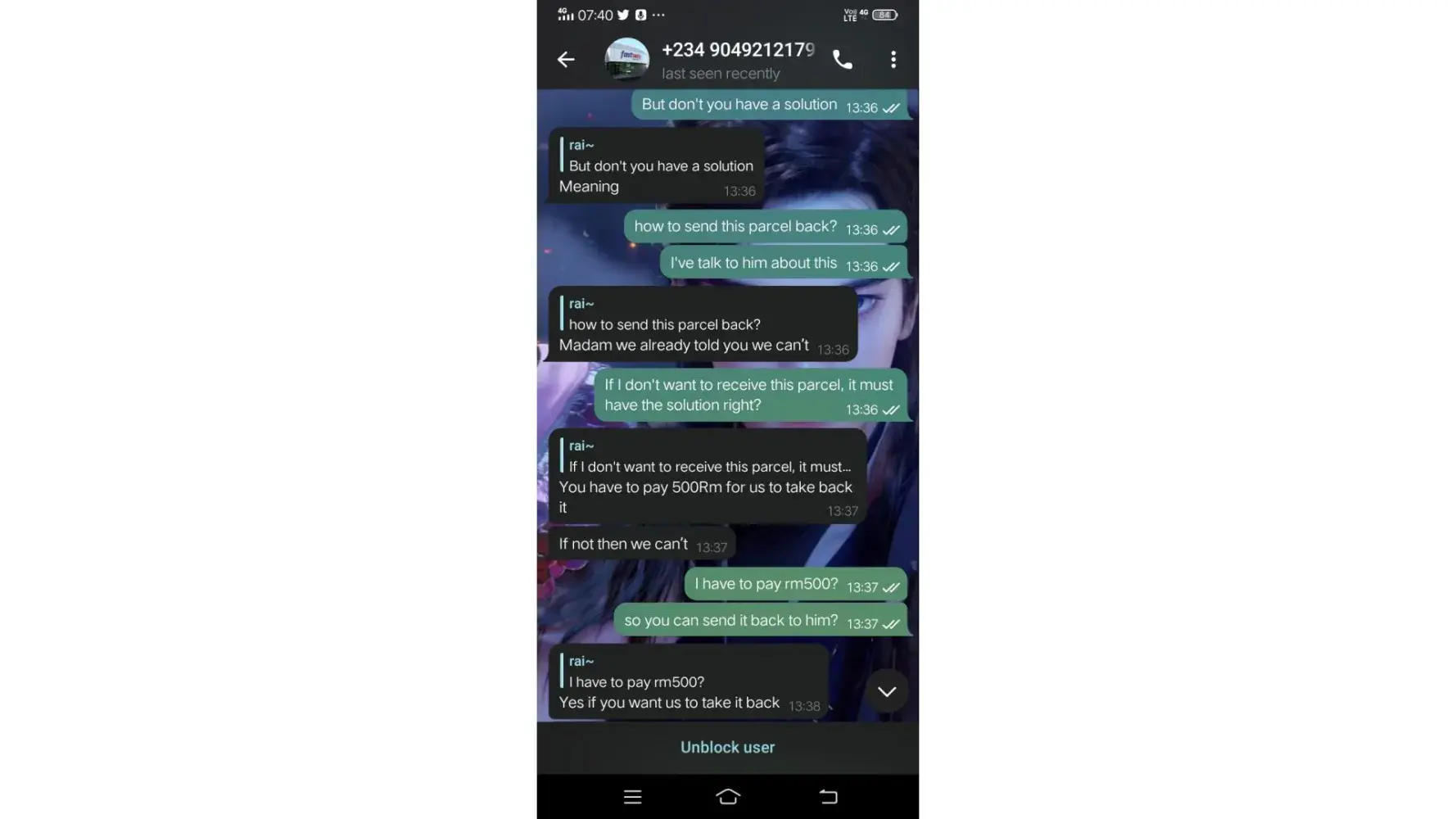 then after two days a man from malaysia called my number telling me my parcel is on hold because it was detected with money and has violated the law