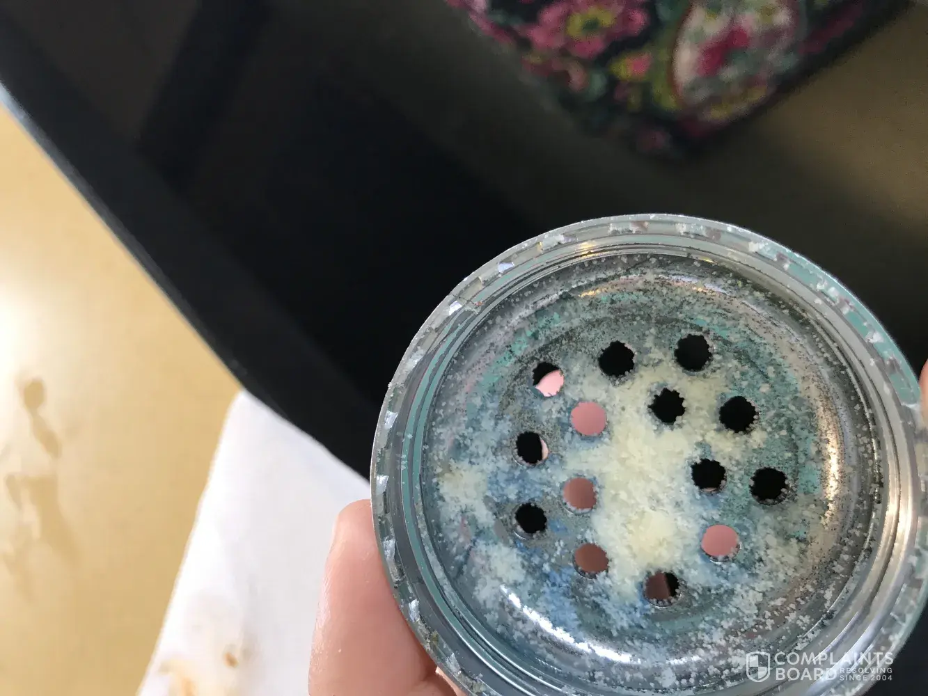The Parmasean cheese inside the lid had mold in it and I checked several bottles and they were all like this and bout made me want to spit up my food very nasty. It is in in sanitary and could cause someone to get very sick such as myself please take this in consideration and do something about it. Have them clean them out nightly or over other night at least. Thanks