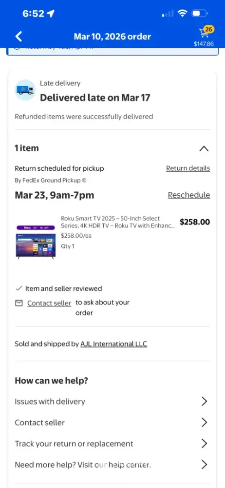I had a package from Walmart, a Tv. It was reported missing during delivery and I received a refund. A week later it shows up. So Walmart emails me to return it or I will be charged. So I submit a return with Walmart and FedEx is scheduled to pickup the next day. The TV was there in the morning and so FedEx picked it up. Then it’s lost again. Walmart...