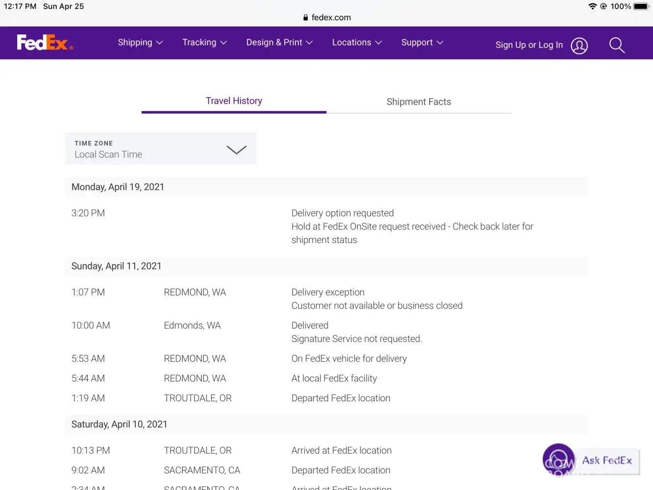 FedEx delivery was claimed to be on the 11th of April 2021 and that the next attempt would be on the 12th of April.