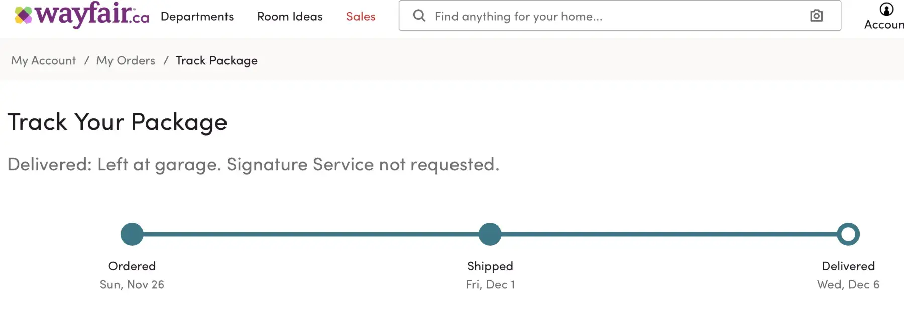 I spent the day at home. Around 4 p.m. I stepped out of my front door (single family home) to take mail out of my attached mailbox, and saw at the end of my walkway a package leaning against the corner of my front-attached garage. It was a large, heavy futon mattress in a package about 6 feet long and very heavy. I was alone at home, and because of thefts of mail and packages in my city being on an increase, I knew I could not leave the box outside unattended. I grabbed it by the end and started pulling it towards my front door, walking backwards. It was very difficult and awkward to handle. Near the front door I stumbled against the one step leading to the front door and fell backwards. I hit my head on the door, and my hip, outer thigh shoulder and arm on the left side on the concrete step. I am now sure and bruised and having muscle spasms in my mid/upper back. I am very angry that the delivery person did not bring the package all the way to the door which is about 30 feet away from the garage corner where he left it leaning. I believe he didn't bother ringing the doorbell because if he had and I opened the door, he'd feel forced to bring the heavy package all the way in. Needless to say, I am very upset. This shoddy kind of service should not be tolerated. This delivery was completed today, December 6, 2018 to Edmonton, Alberta Canada during the hours of 2 p.m. to 4:30 p.m. Wayfair.ca Order Number