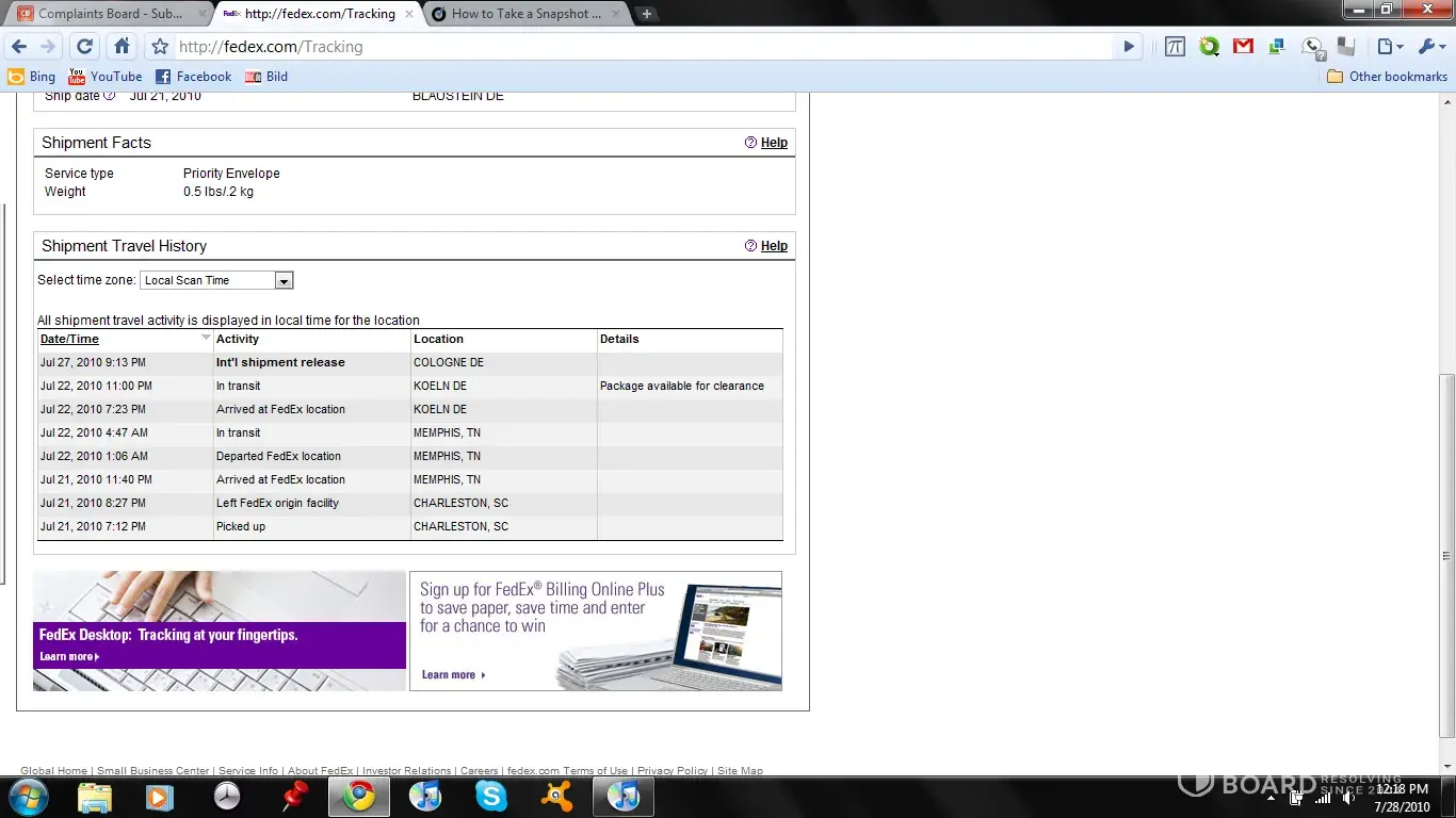 On July 21st I send a document via FedEx with Destination Germany. What is advertised to take 2-3 days, has now taken over a week, and the envelope has still not reached the recipient and there is no end in sight to this problem. Everything worked out great at first. The envelope left the US and was in Germany within a day. However, since then the Envelope has stayed in the same location in Germany (Cologne) for the past 6! Days! Which is UNBELIEVABLE! Upon many calls I never received a clear answer on what is going on with the letter. Nobody, especially FedEx Germany has a clue what happened to this highly important letter. If I don't get this letter to the recipient by tomorrow, it could lead to some serious financial difficulties for me.