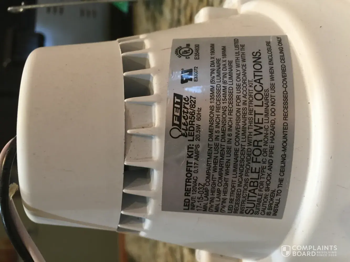The Feit electric LED retrofit kit failed within 3 months to 1 year . I replaced 6 ceiling lights which I bought @ BJ wholesale club. Attached is the photo of the light kit and tag info. I replaced all with another brand and didn't want to waste more money mailing them back for replacements because all the kits failed.