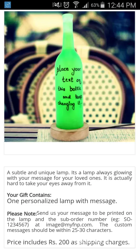 Had ordered a personalized lamp which I found as one of the unique and beautiful product on your web. Unfortunately the final product sent to my niece with message didn't appear good at all. Although there wasn't any issue with the lamp but the way message was printed (uppercase, big font size)spoiled the whole thing. Â I am attaching the pic of original product advertised on your website and the one which was delivered to me.