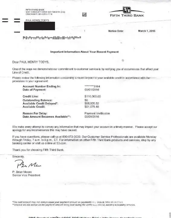 I just received a letter from Fifth Third today telling me that there is a hold for 9 days on my Fifth Third HELOC, as I just paid the outstanding balance down to zero from my Fifth Third business account to my Fifth Third HELOC account. And, I did this in person, at a branch office. Correct me if I am wrong, but this payment transfer was made from an...