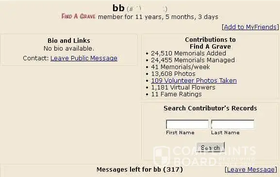 A couple of days later I was trying to enter a memorial and my account was cancelled. I checked for my memorials and they were all deleted! All my photos and information was gone. I couldn't believe it, and I thought it must be an error. I contacted the admin to try and figure out what was going on. I asked them why I could not log in to my account. I didn't get a response. So I wrote again and asked them why my memorials were deleted. No response. I wrote a third time, asking when my account was going to be restored. No response. That was 8 months ago and I have never gotten a response. I checked the BB members account, and suddenly she's been a member for 9 years. After another couple of months, I checked it again and now it's up to 11 years. She IS the admin. For whatever reason they deleted my account and all my memorials then BB and some other members, probably admin as well, began stealing the information and the photos and posting them as their own. I lost years worth of work, including travel time all over the country and countless hours of research.