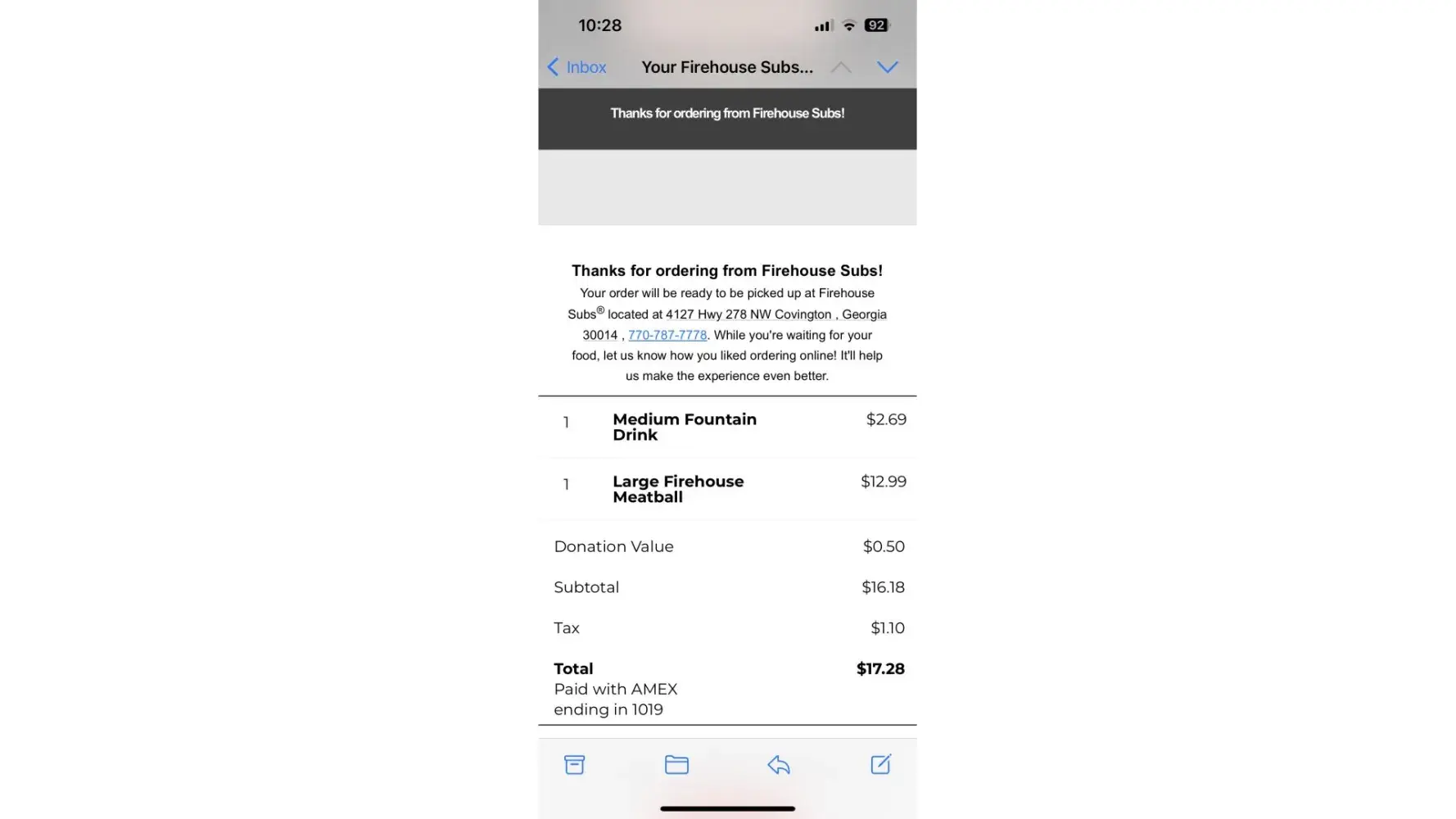 My son placed an order on my phone for Firehouse Subs on the app. He didn't realize when he submitted the order that the last location we picked up from was outside of Atlanta on a trip passing through. We live in Augusta and he thought he was picking the order up in Augusta. I tried to cancel the order immediately but that was not an option, so I went...