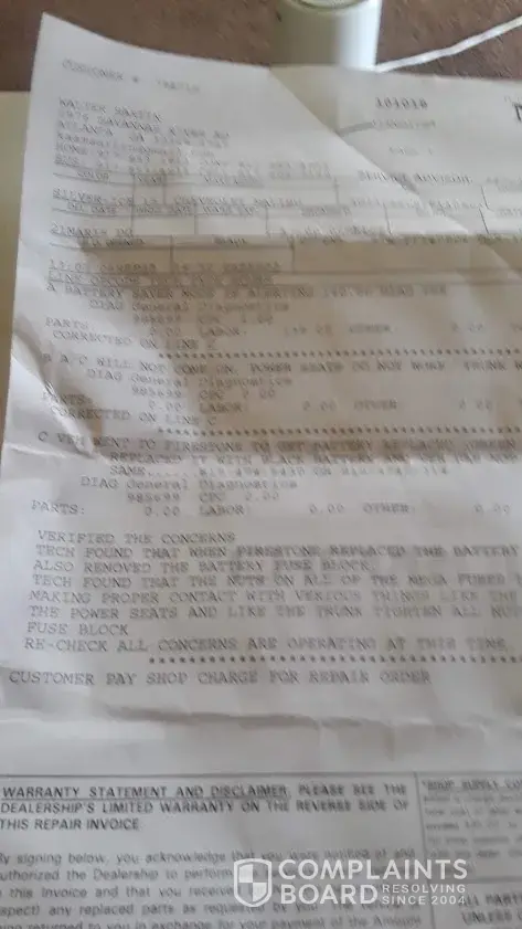 We Took car to firestone to have them replace car battery 8/19/2022 that was still under warranty. Firestone kept car for 10 days. Firestone performed faulty and unnecessary diagnostic. When we got car back from Firestone on 8/29/22 Techs had screwed up electrical system. Air conditioner did not work, power windows, power seat, power trunk lock, head lights did not work.