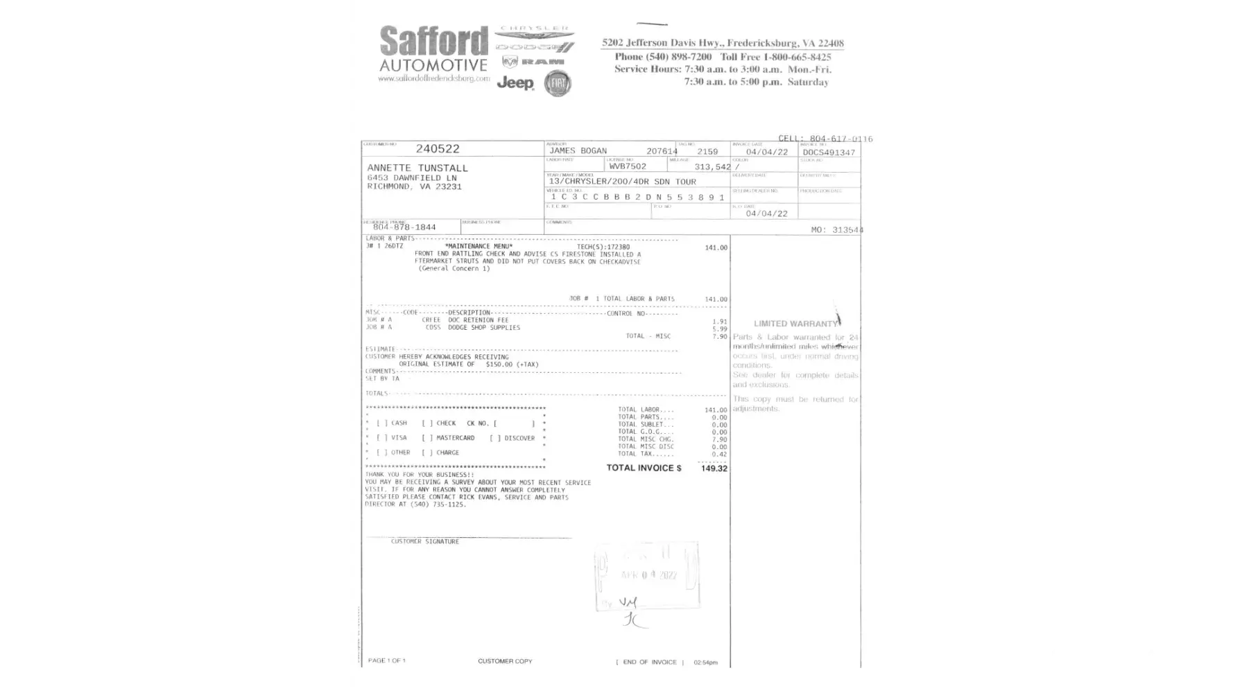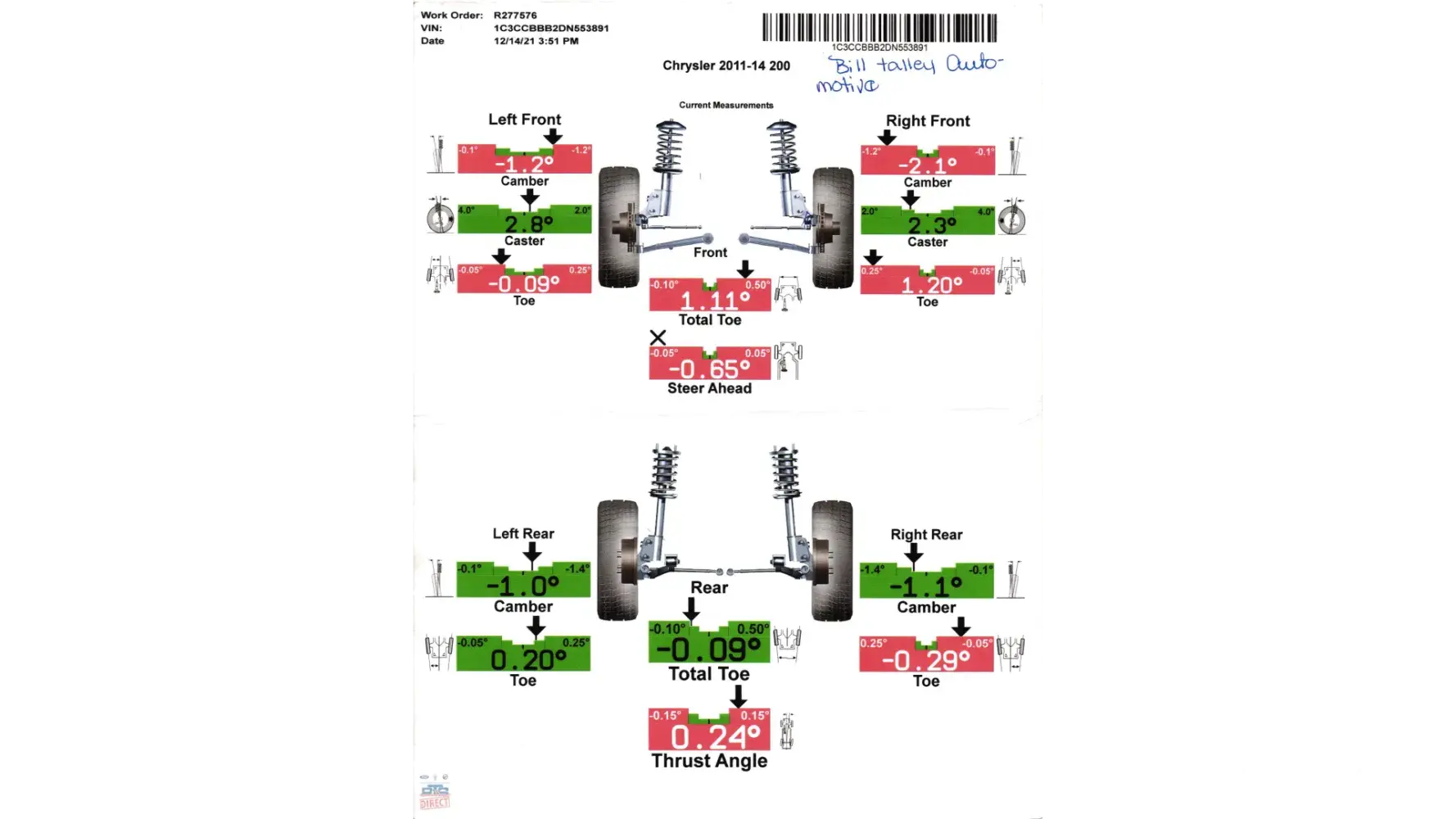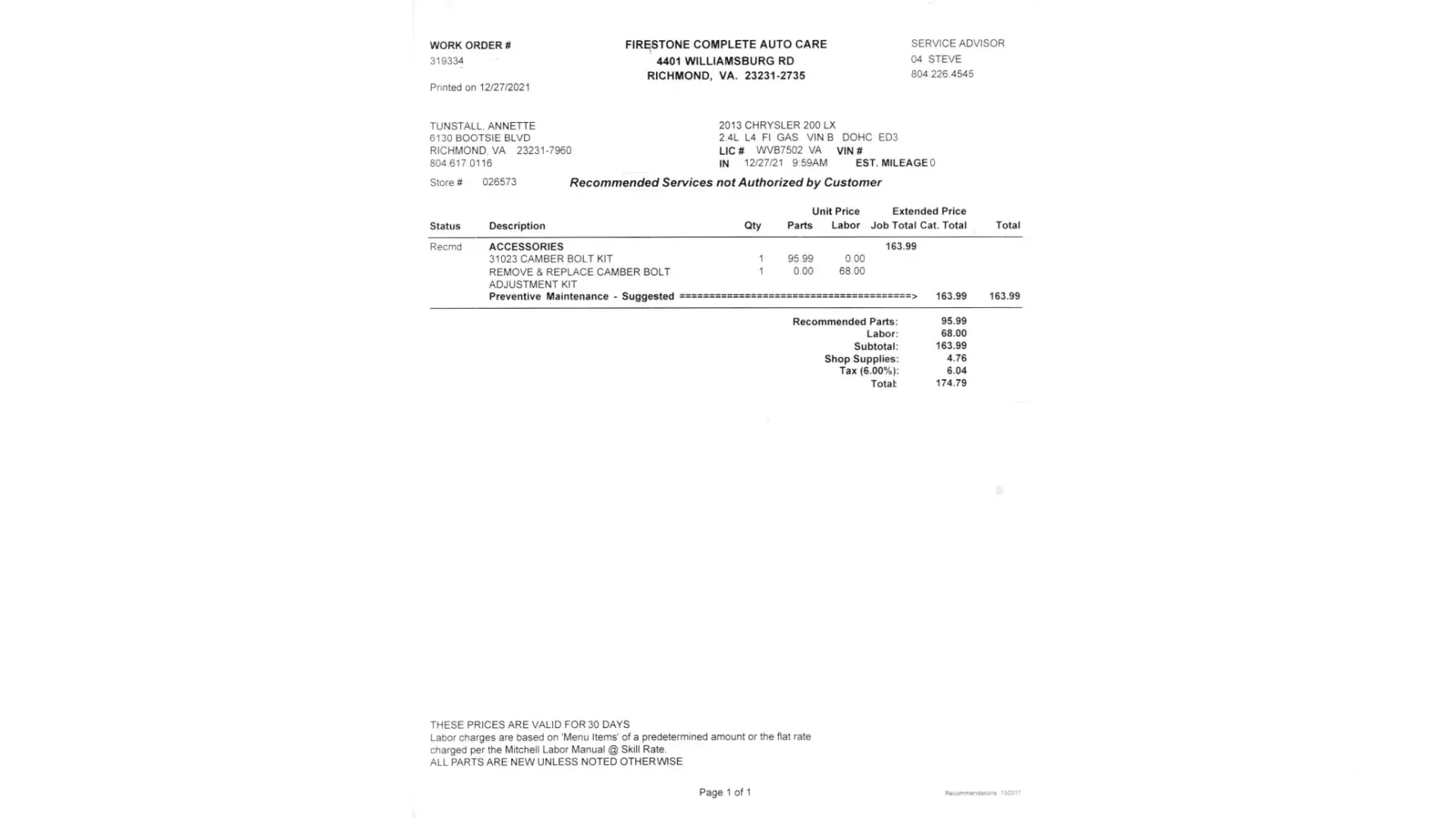 12/27/2021: Drove car to Hayley Chrysler and Jeep where as they indicated what Bill Talley automotive stated and they noted that the struts where off market struts (something they do not recommend for my car) I drove car to firestone complete auto care – 4401 Williamsburg Road, Richmond Va. 23231 where I confronted them about the off market parts they place on my vehicle without my knowledge. They stated that the part replaced has a life time warranty. I careless about a lifetime warranty. I want quality work and performance to which neither was given to me for the price I paid. Once they replaced the strut and conducted a before and after alignment, the tech tells me that they cannot do anymore alignment because of right front which will require a camber replacement (on the same side as the damaged/ replaced off market strut). It wasn’t damage when they did the service now it needs to be replaced and I cannot get another alignment until replaced. (But I’m supposed to have an alignment warranty with the repair done 10/4/2021).
