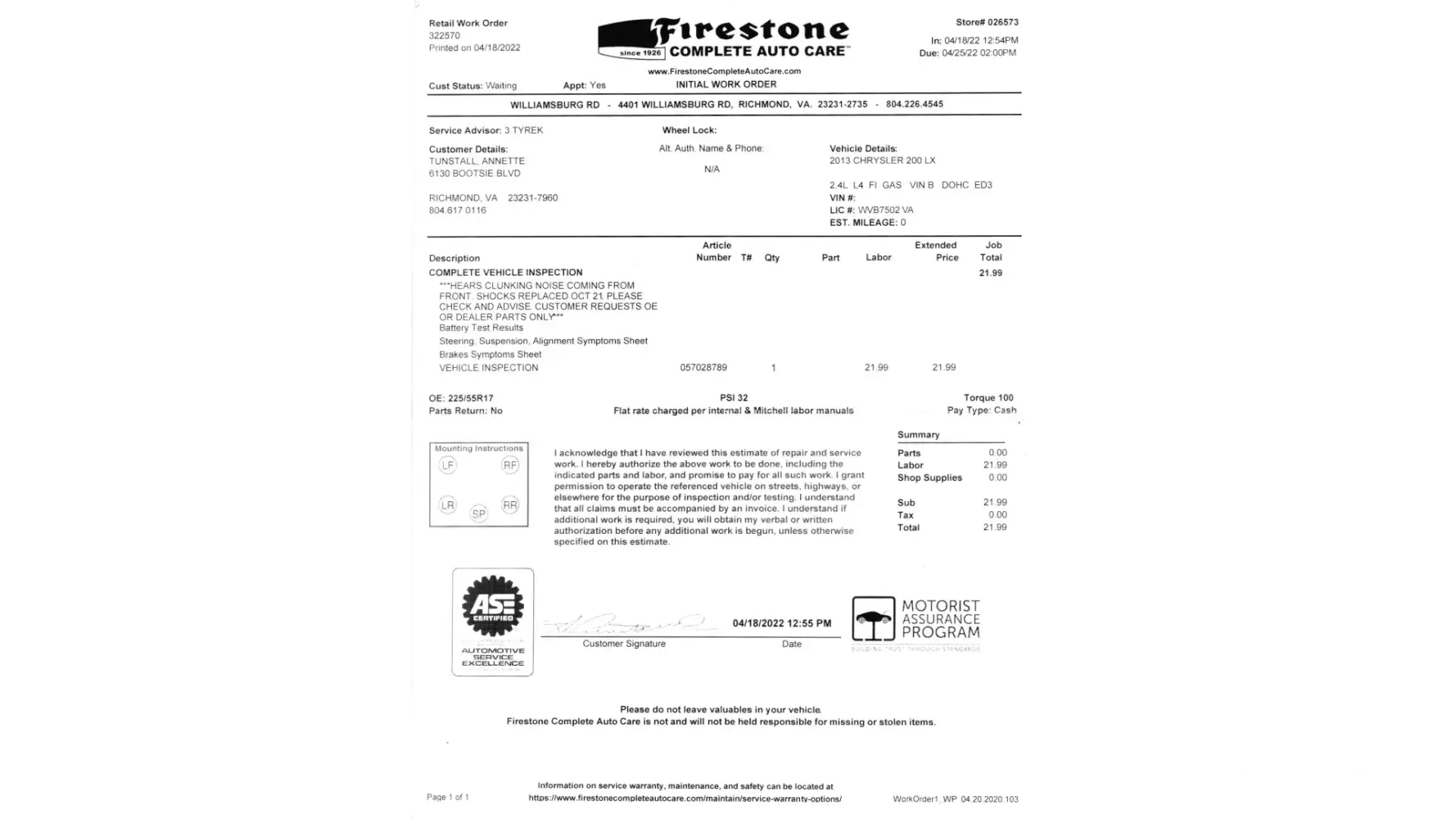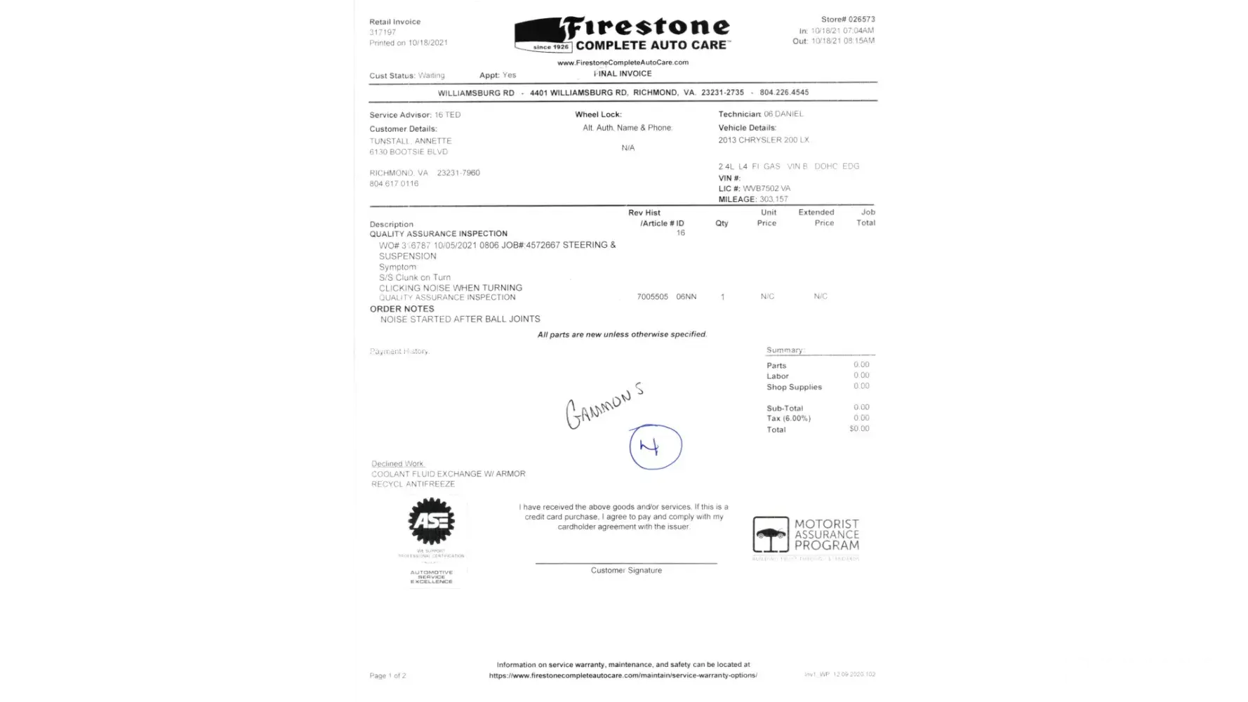 10/04/2021: Brought my car in for service to from firestone complete auto care – 4401 Williamsburg Road, Richmond Va. 23231. Upon leaving the shop, I notice the reason I brought my car there was not resolved. Car was making clicking noise when I turned and crackling noise when I was driving the car. I turned around and brought the car back to firestone. The mechanic who replaced the parts stated that he could not hear any noise (he heard it. He choose to ignore it). So he replaced the stabilizer bar control. I proceeded to drive away only to find that the issue and the reason my car was serviced there was not resolved. Car was making the same noise it was when I brought it there to be fixed and continued afterwards. I called firestone again and brought my car back on 10/18/2021. They scheduled an appointment with Hayley Chrysler and Jeep for an inspection. I informed firestone that I was going out of town end of October 2021 for surgery and will not be back until December 2021. Appt with Hayley Chrysler and Jeep was set for 12/27/2021. Car sat in the garage for the entire month until I returned.