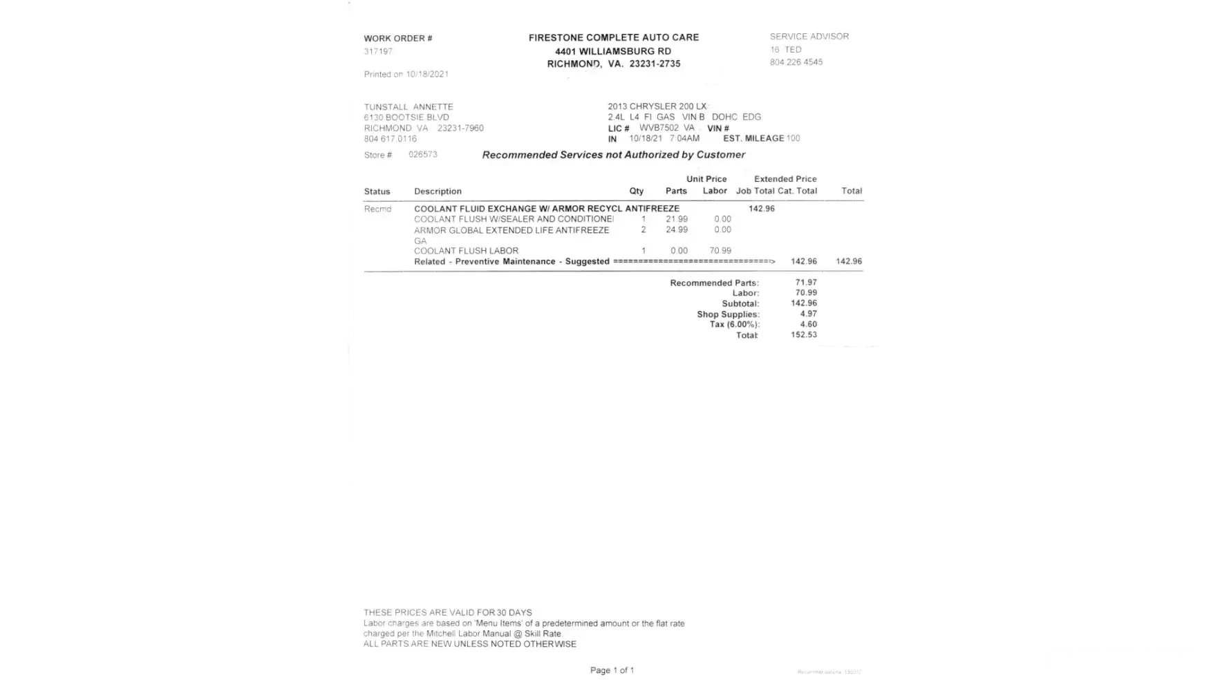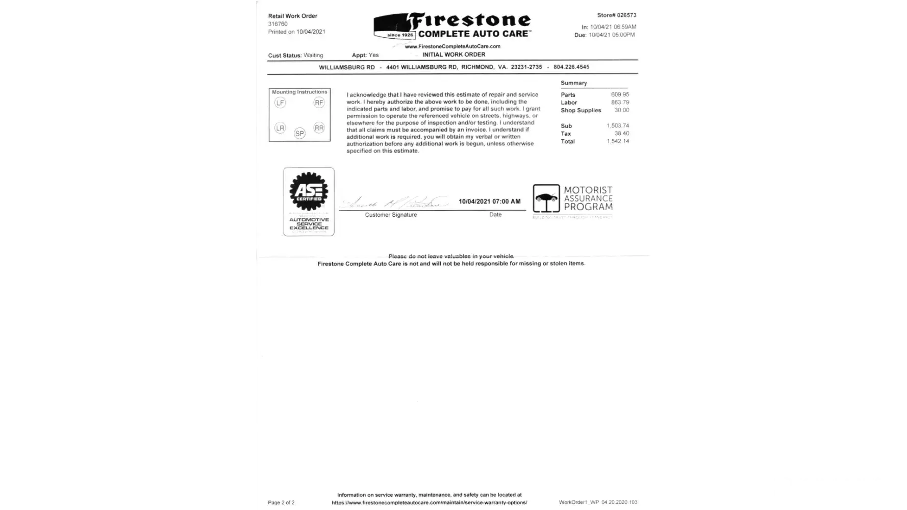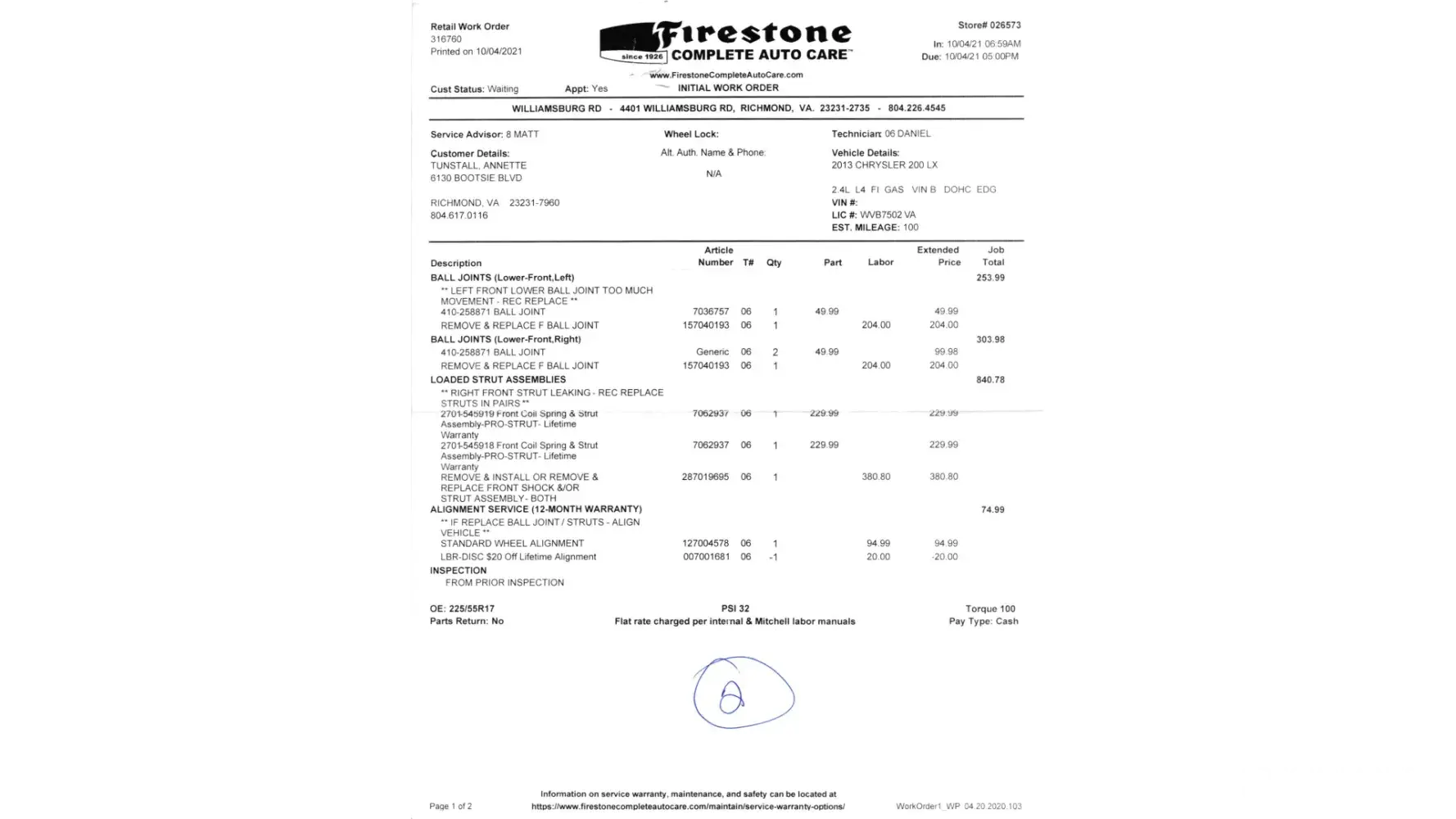 10/01/2021: Received a quote from firestone complete auto care – 4401 Williamsburg Road, Richmond Va. 23231 stating that I needed to replace ball joints (left and right), struts and alignment after they test drove my car.