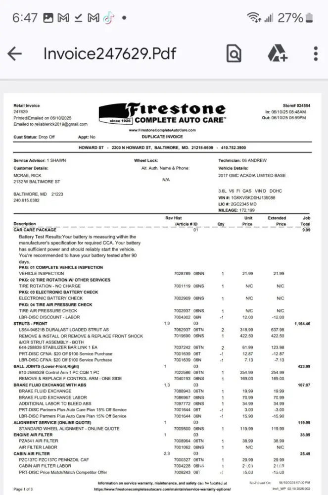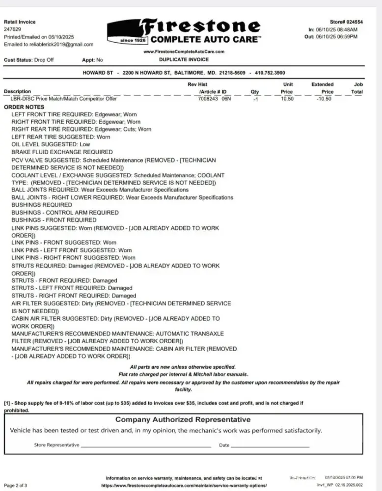 Recommendation: If you already know what's wrong with it take it somewhere else you probably will pay cheaper. That what I do. Very disappointed with Firestone