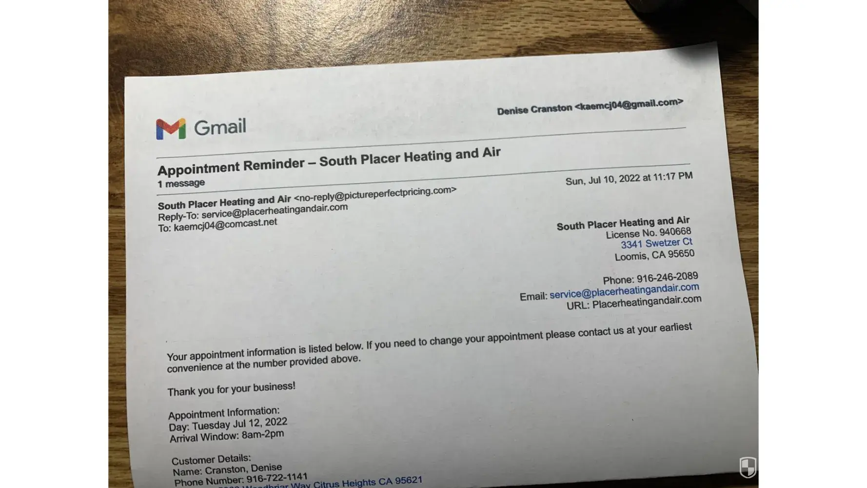 On 7/10 I received an email directly from South Placer Heating/Air. They had provided me an appointment time on 7/12 between 8-2. No show. No call. This company should be fined for wasting people's time and money.