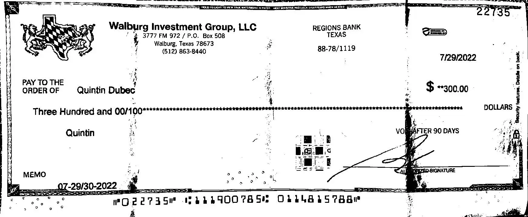Please keep in mind that I've been depositing checks from this same company for well over two years. I also just deposited a check from this company for $650. None of those checks for the past two plus years have had a hold on them. No one has changed accounts or banks.