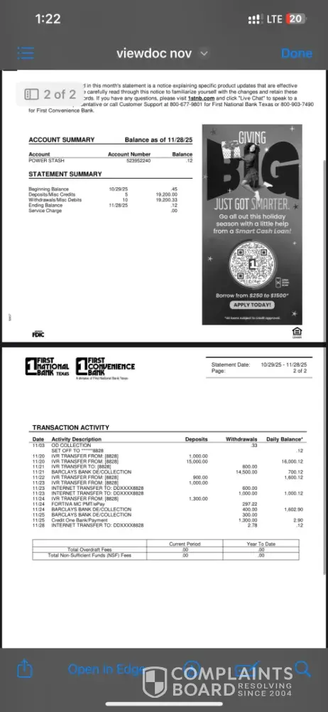 On 16/12/2026 I received $14,530.07 from Barclays Saving account number ending …8769 and $701 from Barclays savings ending …6267 on my First National Bank of Texas Checking account ..it was sent by a friend Lisa Paquet .. after the money settled on my Checking account ending ..2240 few hours later FNBT illegally closed my account without my notice and...