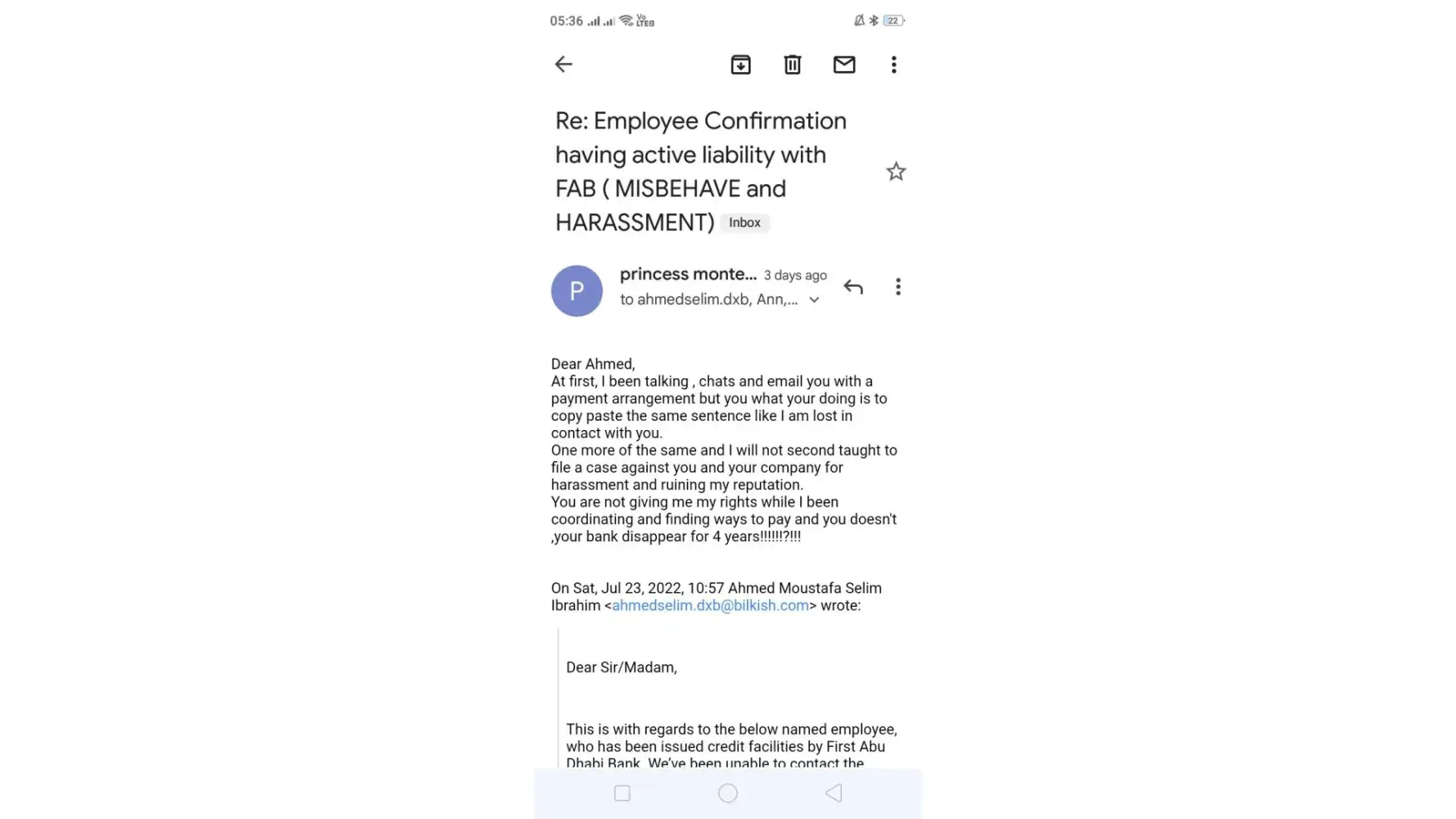 I have AED 5000 remaining liability in FGB back in 2016 and applied a settlement plan in 2017. The bank never get back to me and disappear for years after than and suddenly from Bilkish company Name Ahmed Salim is harrasing me by sending emails for all company employees stating that I have a liability repeatedly, email and WhatsApp the owners and HR manager. I already been warned of the harrasment that will lead to my termination sooner. I been repeatedly telling them that I can pay a monthly installment payment on the principal amount but they wanted a 1time shot payment of AED15k. They don't stop harrasing me even I warned not to copy everyone but it damage has been done and I'm the talk of the whole organization. Kindly resolve my issue and I will not coordinate with this company anymore. I been very cooperative and giving solution coz I prefer to have peace. call me on my mobile @ [protected]