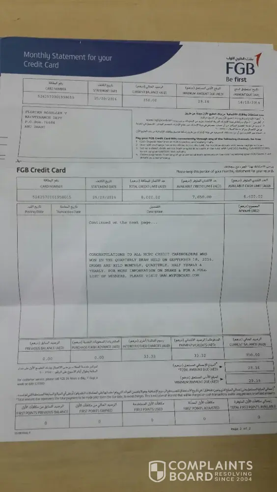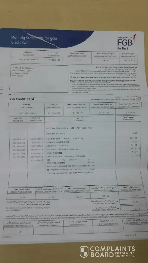 I am a very disappointed customer of fgb bank, after complaining several times regarding irrelevant amount of aed 60 for accidental insurance is charged to me without my authorization, even after my cancellation request and assurance provided by the agent again aed 30 was charged to me for the 2nd time and still the clarity is a question mark?