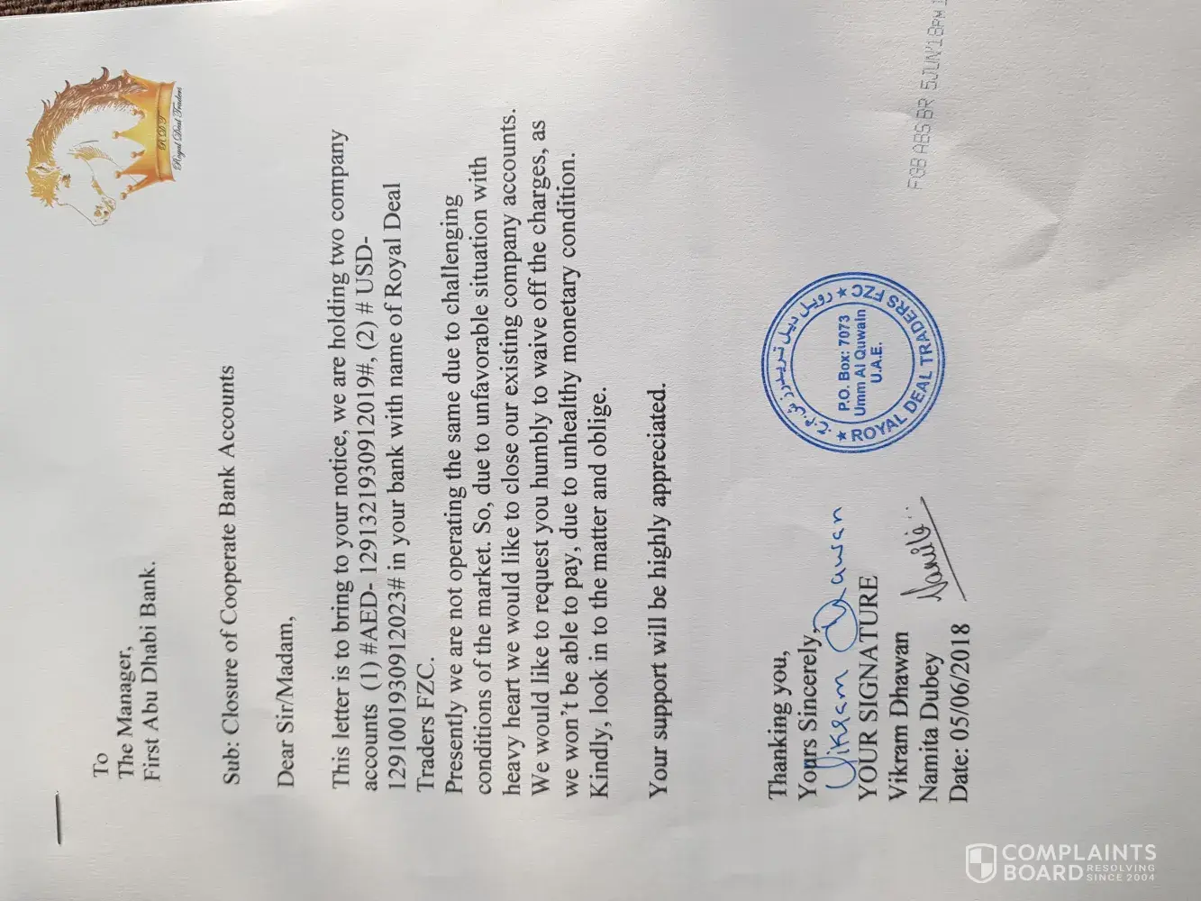 First Gulf Bank [FGB] closure of my bank account number [protected] and [protected]