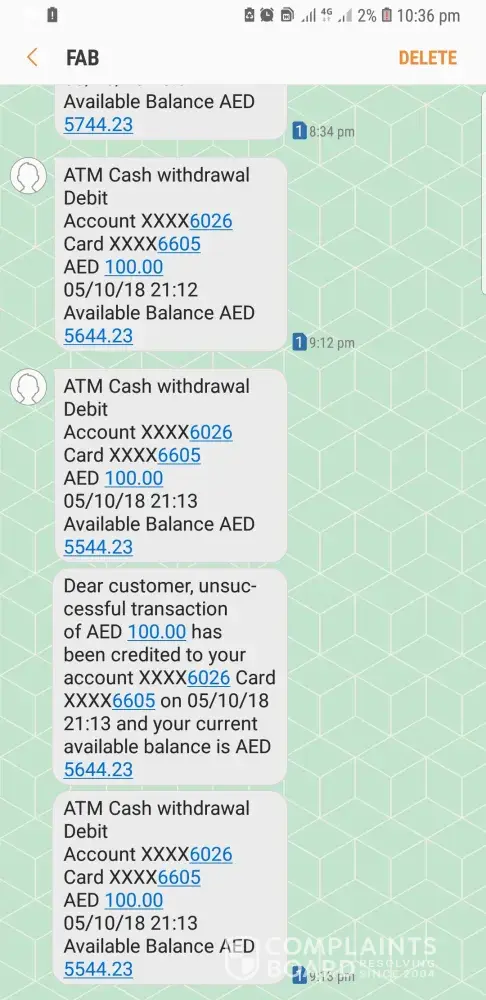 I got 2 msgs, 1st is 100 dhs debited available balance is 5644., 2nd msg i got 100 dhs debited available balance is 5544..,