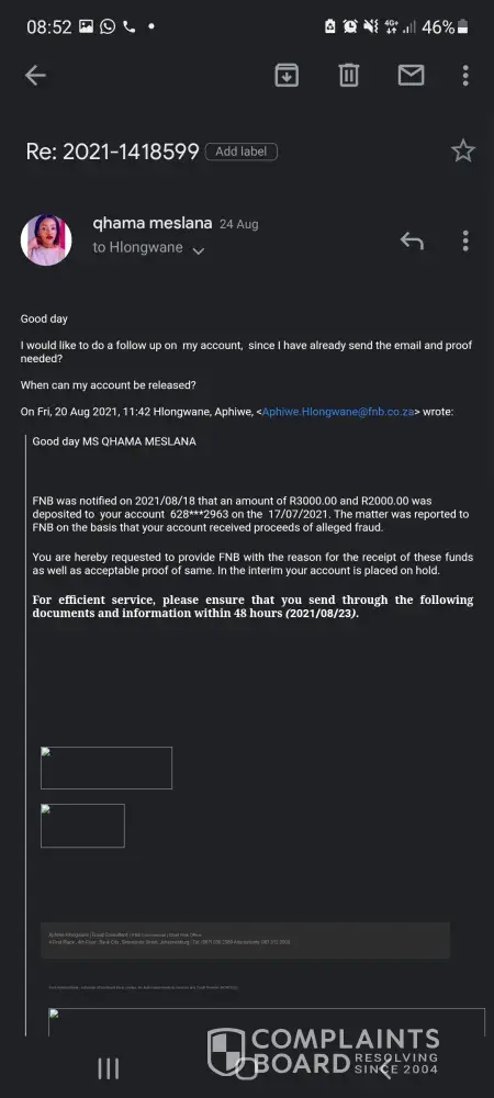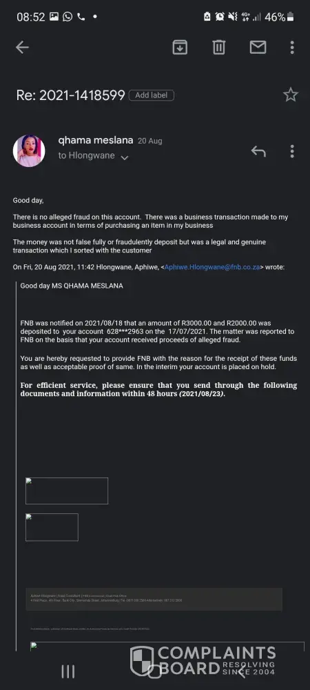 On the 18th August 2021, I received an email from Aphiwe Hlongwana stating I have received proceeds of alleged fraud. I did provide proof and an explanation to what was it about. I have been requesting feedback from him with no reply and what I am not happy about is that my business has been put on hold and I just want the verdict of the case so I close all accounts with FNB and switch banks I am not happy at all