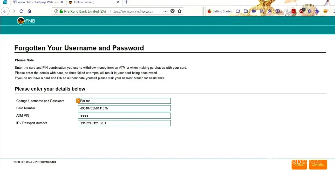 Herewith "Screen prints" referring to my attempts to reset my password on the FNB Home page :- (Please note that the Credit Card number I use is the correct number as on my FNB "Classic" card and the expiry date is - 07/19 issued to Gloria E Fishe.r