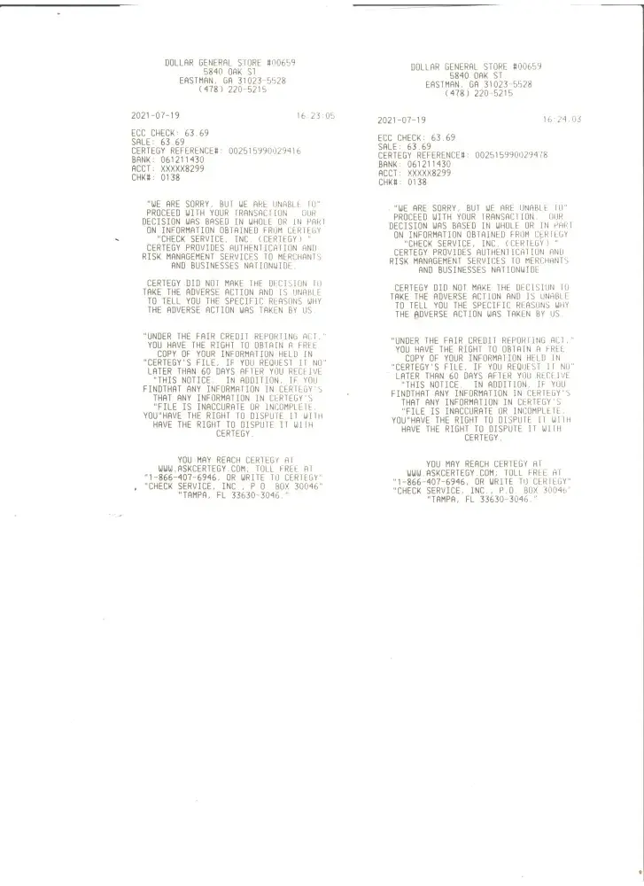 On July 19, 2021, went to Dollar General, store 00659. Check for $63.69, was declined. I was confused, but I wrote another check from a different account, and that check, too, was declined. I called them, only got a recording, but did get to request a copy of my file.
