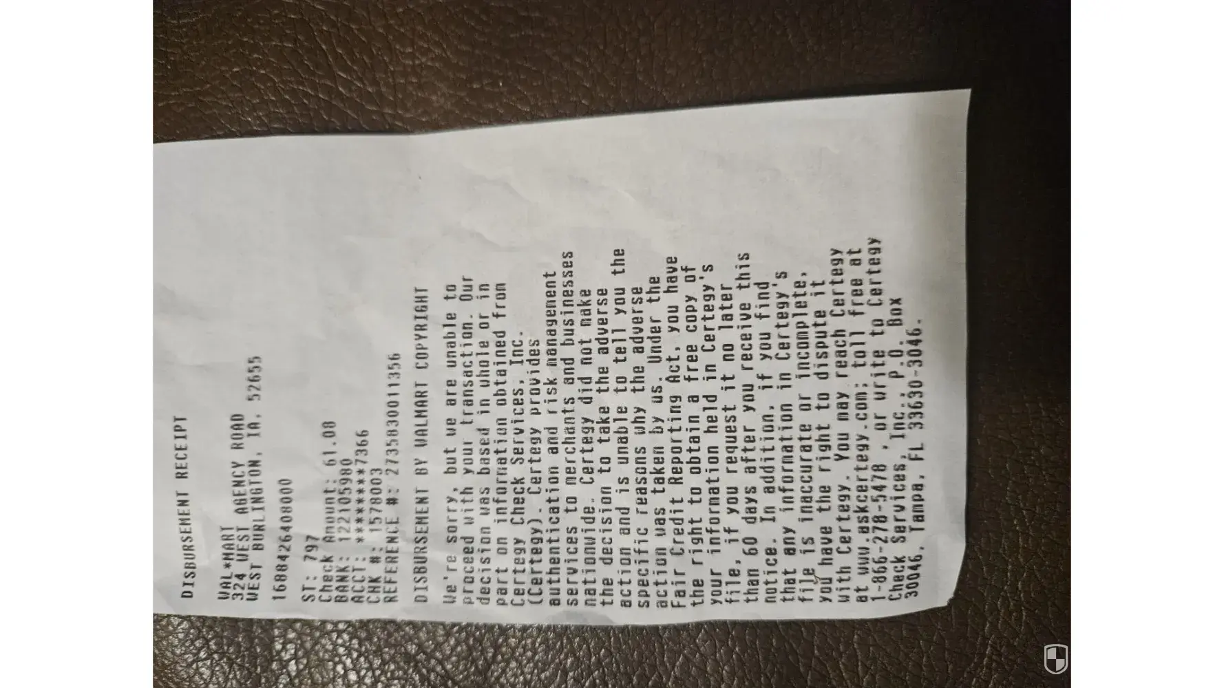 I went to Walmart to cash my government refund check only to be denied. I'm thinking, for what! I want to know why but the clerk didn't know and gave me a printed receipt to contact this so call company (certegy). So I go to another walmart, same thing. So I called and get an automated attendant and gave me a handful of possible reasons (no specific). It gave an option to have a copy of their reason to my by mail so I opted in. I receive the letter and it basically gave me the same handful of possible reasons from check #, dollar amount, check cashing history, or other transaction history "quote for quote". Nothing specific to me.