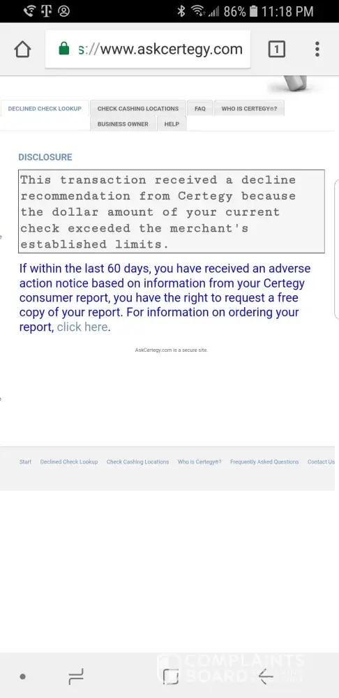 FISGlobal.com / Certegy declined checks for no reason