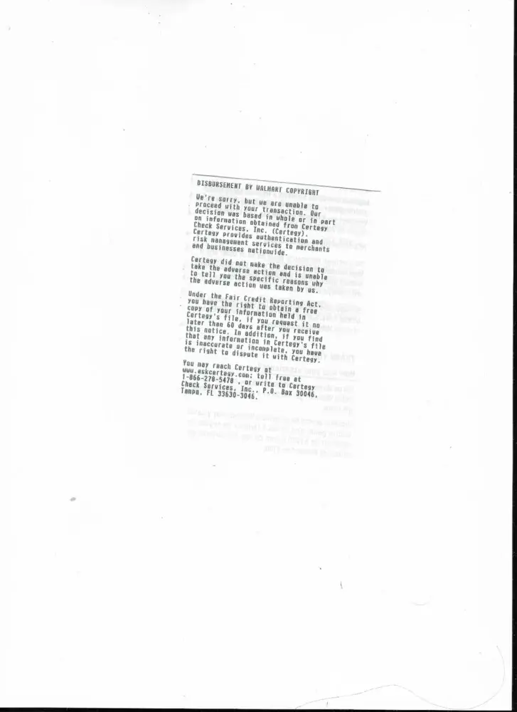 So, I said fine, I will just go cash the paper check, and then deposit the money to my account. Of course, the check came in the mail on a Saturday, so going to my bank to cash it was out, and my only true option was the Money Center at Walmart. I was not happy to have to pay a fee to cash a check, but I figured $4 was not a huge problem. As such, I went ahead to Walmart to cash my payroll check, from the city, and was told that these Certegy people had flagged me as a check fraud high risk somehow. This almost knocked my off my feet, as I have never bounced a check in my life, have a strong credit rating, and am paying off every bill that I owe consistently.