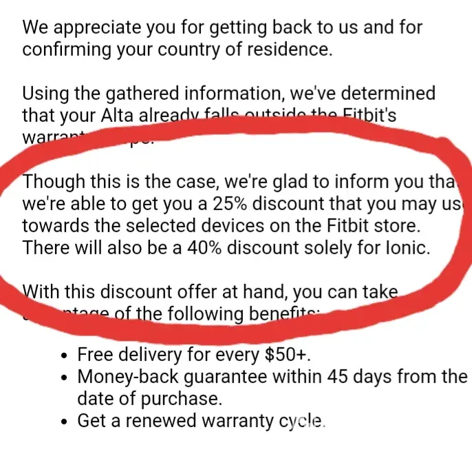 Today, I was able to speak with Chenelle (the last point of contact MANAGER).. I have a Fitbit alta that stop charging. After stating my complaint this is the email I received. Please everyone comment to decipher how you interpret the email and the meaning of ALSO? Ionic 40% off plus 25% off? OR 25% off or 40% off ionic, but not together?