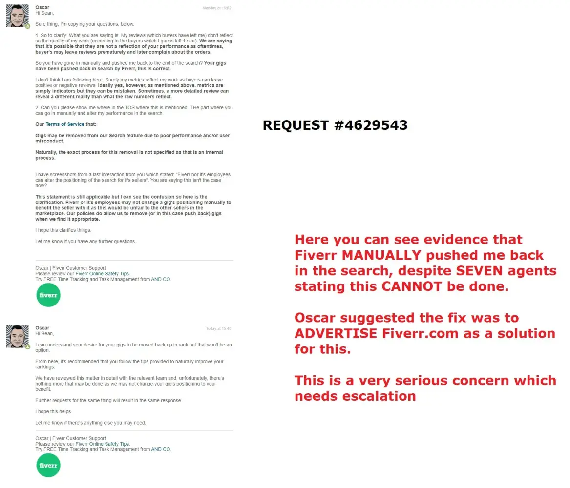 1. Fiverr customer support is lying to it's sellers stating that they cannot influence search presence for gigs. See attachment: "fiverr lying about being able to manually change search presence. Jpg". They closed out my ticket when I had concerns over my search presence making me feel like I was wrong. (see request #4586391). They even threatened me for wasted customer supports time. (see #3991138 where roberto states: "this has been addressed several times now and you are currently spamming customer support, we ask that you refrain from doing so as this will cause your account to be reviewed by our support team.")