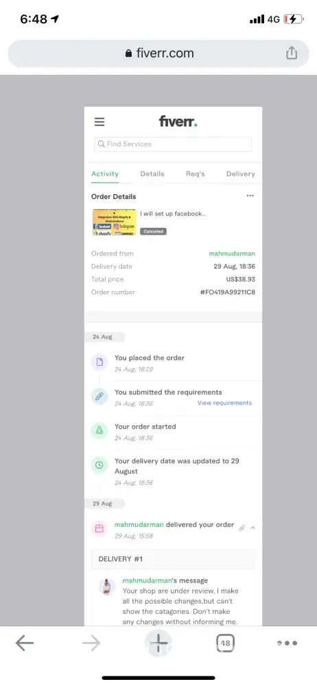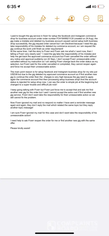 But Fiverr is very clearly I don't want cancel the order because the seller make a mistake cause my Facebook business account lost and o need the seller fix their mistake and finish the order but Fiverr know that still cancel the order!
