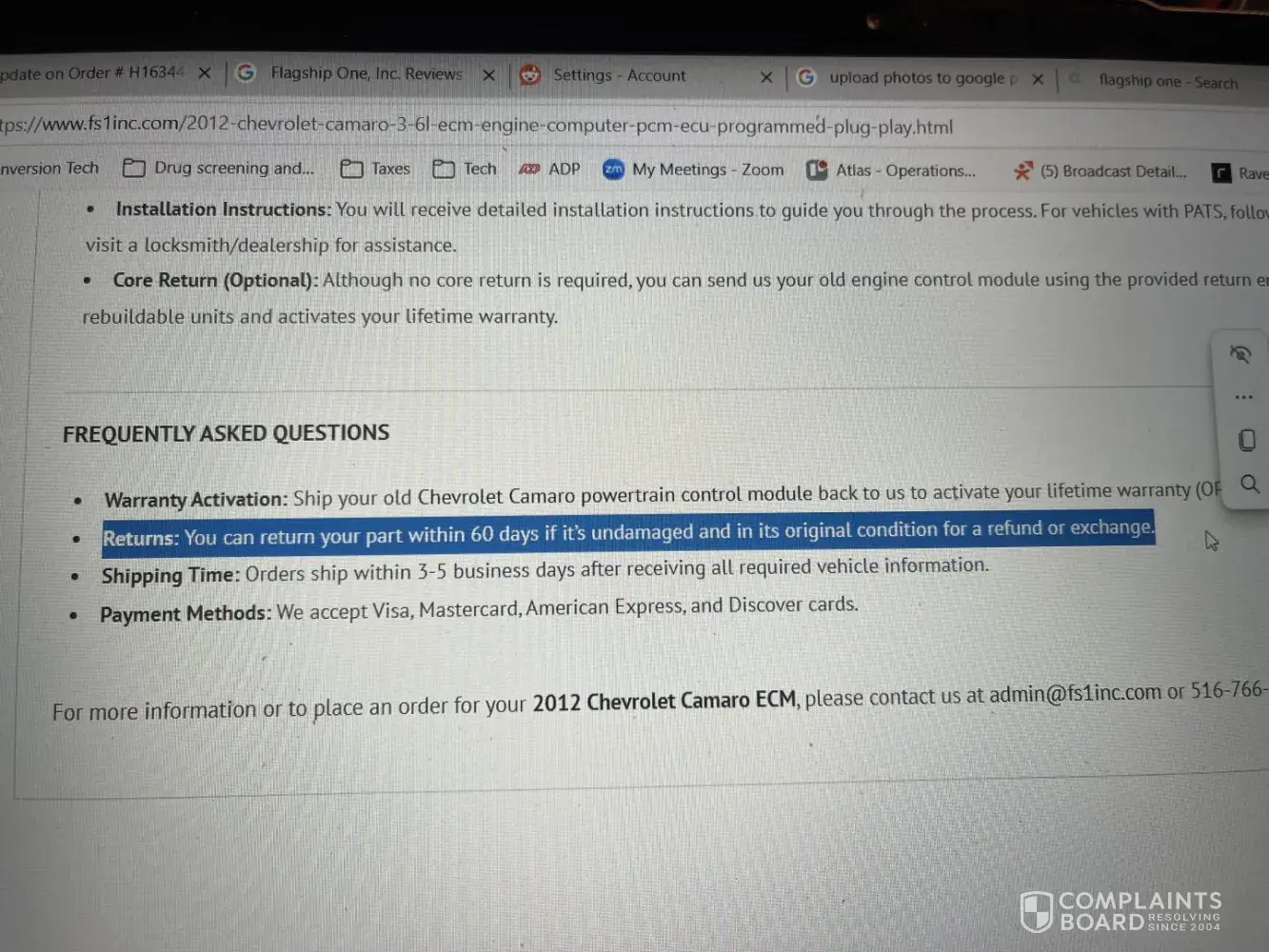 This company, Flagship One Inc (fs1inc.com), has the worst customer service I have ever experienced. They will gaslight you and lie to you when you call back to confirm information. I had an issue with the Vin numbers showing manufacturers dates and their account manager told me that 2 ecms came out of a 2011 Camaro and the last one, which is the third non-working computer sent, was a 2008. This is insane because a 2010 car can't take a 2008 ecm. When I told them this, they didn't listen and kept hounding me about what scan tool was used. It's not a scan tool to install a computer on a 2010 Camaro, it has to have a paid subscription for GM tech tool that can be on a laptop and is used for relearning the keys so everything can communicate. However, their ecm would not recognize the keys and when I told them this, they ignored me and played games so I would get frustrated and give up.