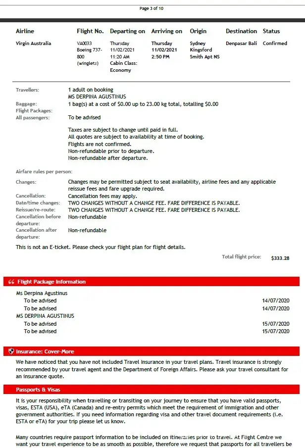 We have been extremely disappointed with the service that we did not receive when we needed it whilst overseas, hence resulting in the cancellation. We do not recommend this agency to anyone, it is much easier and cheaper to book flights yourself as you will not get the assistance needed when you do need it anyway.