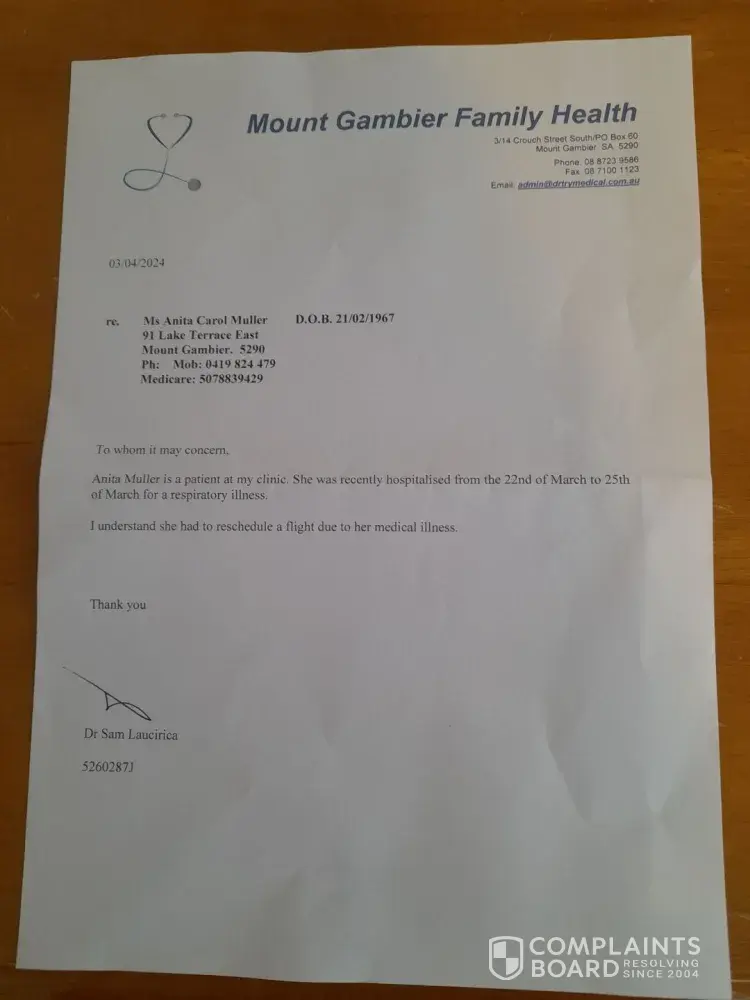 Hi my name is Anita Muller and i wish to make a complaint about Flight Centre in Mount Gambier SA. I booked a return travel ticket from Brisbane - Adelaide - Mount Gambier which was meant to take place on the 25th March 2024. The ticket numbers are ZL913 and ZL4643. I became unwell on the 20th of March and needed to get back to Mount Gambier asap. I rang...