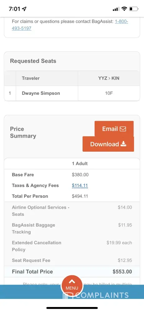 Please contact me in regards to this matter at [protected]@gmail.com or call +[protected] Beverley Eugiene Swaby who Who purchased the ticket on their credit card and is my mother.