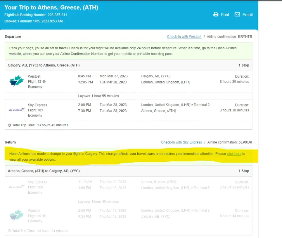 [edited] - We purchased 3 round trip airline tickets from Calgary AB to Athens Greece, Calgary to London, London to Athens, Athens to London, London to Calgary. Only by checking our itinerary did we discover that the return flight Athens to London had been rescheduled therefore we would not make the London to Calgary connection. We contacted Flighthub right away, they could not/would not offer us a viable alternative. We requested that they cancel the whole itinerary, Flighthub said they would not do that, they would only cancel the return portion. We have requested Flighthub to cancel and refund the tickets price for the Calgary to Athens, they have refused. Any other options they offered us were almost double in price. We are scrambling to find alternate flight arrangements. We are very frustrated that Flighthub did not notify us by email about the rescheduling of the flight Athens to London. They are saying that we now have one-way tickets, Calgary to Athens, not the round trip that we originally purchased. We want our Calgary to Athens portion cancelled and a full refund.