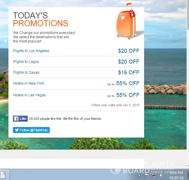 Today Jan 6/16 I thought I was contacting American Airlines directly via telephone but was unknowingly directed to Flight Hub. I typed in American Airline on my computer and this is what comes up. American Airlines™ Canada - American Airlines Official Site‎ Adamericanairlines.flighthub.com/‎+[protected]. So I called the number listed and proceeded to book my flight. The lady on the telephone did not tell me about any offers. Once I got off the phone I noticed that the website has an all day sale offering discounts, she never brought this up. I spent the next few hours trying to get through and was told there was nothing they could do because they already gave me the lowest flight. I offered to email what I was seeing and the woman assisting me declined . The only thing she offered was to cancel my tickets for $75.00. I explained to her how mis leading the website was indicating $20 discount on flights to LAX and she said there was nothing she could do because it was only for one specified flight. That is not true, the website has had this deal on all day. The customer service I received was horrendous and I am very disappointed that she would not even direct me to speak with somebody about this. Here is the deal. TODAY'S PROMOTIONS We Change our promotions everyday! We select the destinations that are the most popular! Flights to Los Angeles $20 OFF Flights to Lagos$20 OFF Flights to Davao$16 OFF Hotels in New YorkUp to 55% OFF Hotels in Las VegasUp to 55% OFF Offers only valid until Jan 5, 2016 I certainly hope somebody from FlightHub contacts me to rectify this.