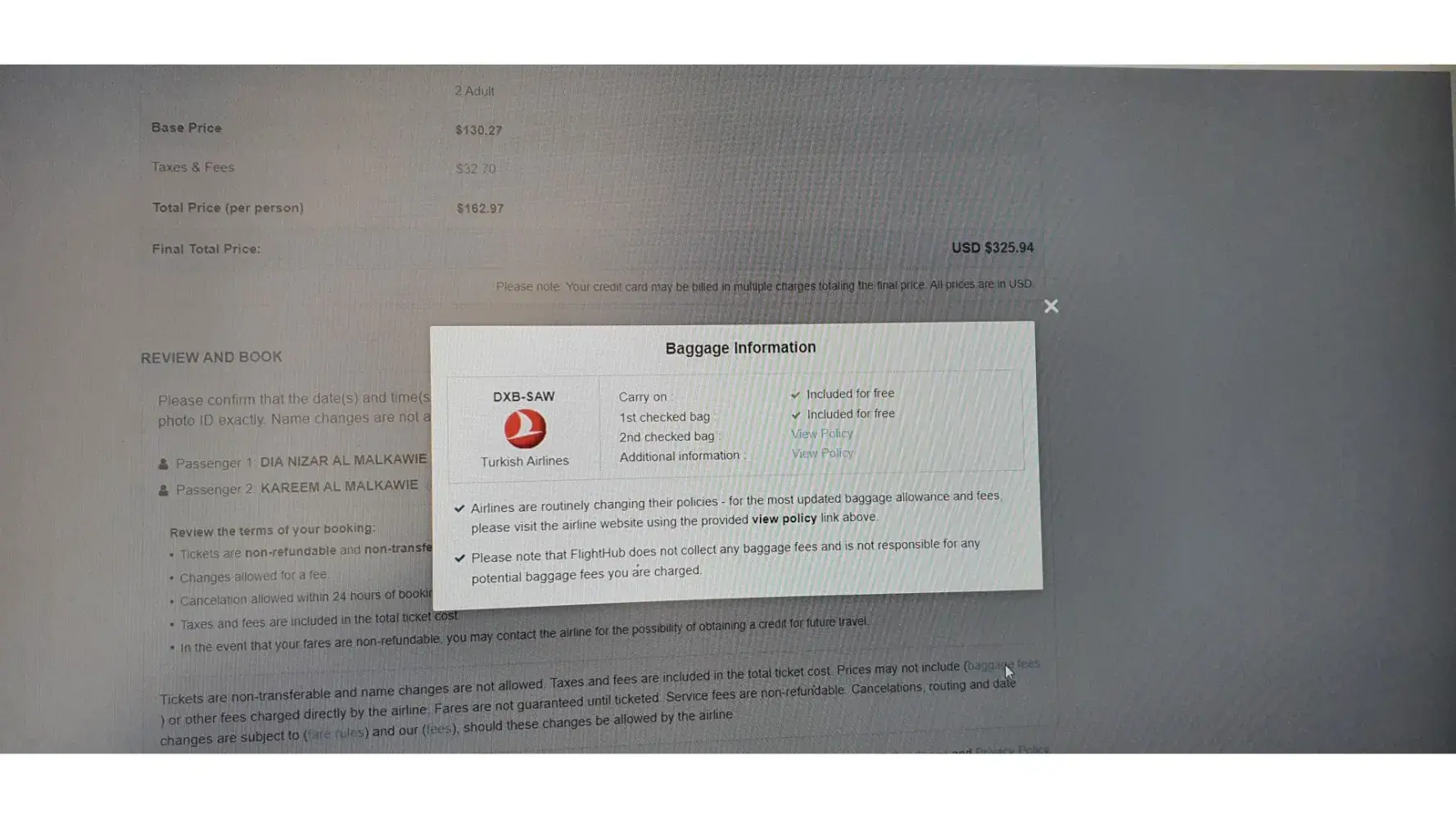 While booking the flight through flighthub for me and for my son on turkish airlines, it was clearly mentioned that i have one carry on and checked bag as showing in the attached photo while booking. booking reference [protected].However, I contacted Turkish Airline to check the bag weight, they informed that no bag is available in my booking!?. Need your urgent support please.