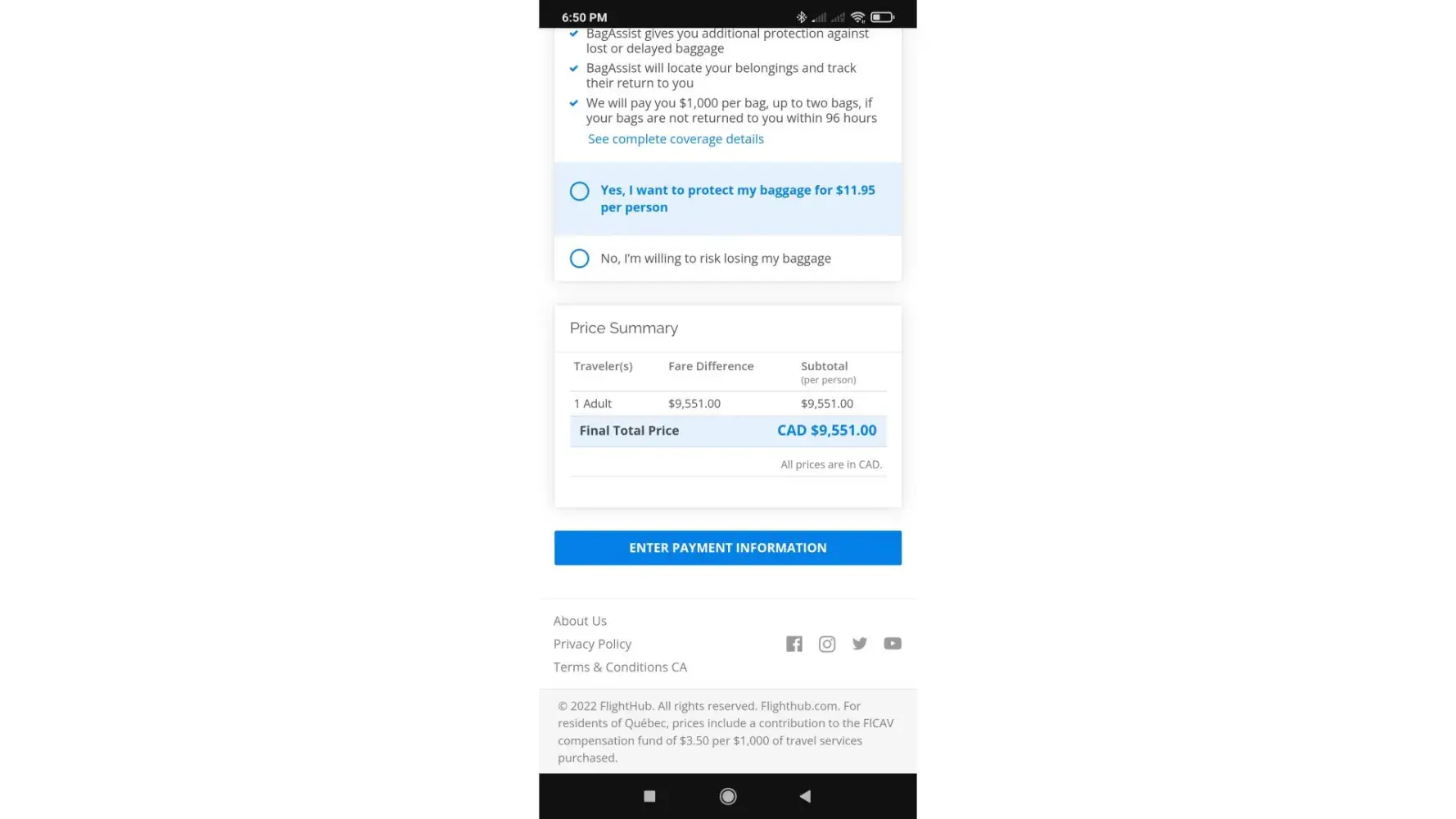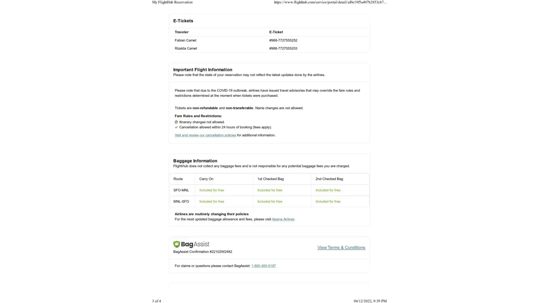 6. My flight is scheduled for today(7/2) night so here I am informing you at 1557H that I purchased cancellation insurance via Flighthub, and that due to my wife’s medical conditions, we are unable to take the flight and we need a full refund.